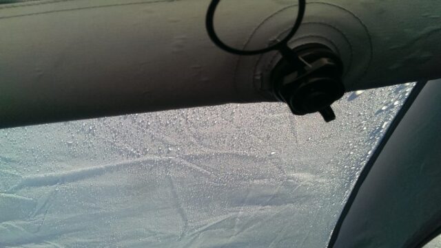 People and their pets exhale air, with the water vapour in our breath normally reaching around 400ml (0.7 pints) per person, per day! Think about that – a family of five, with a dog, essentially chucking over 4 pints of water onto the walls of your tent every day. If we’re talking awnings, add warmer air escaping from the doorway and windows of a connected caravan or camper. That’s a large amount of warm, moist air that’s contributing to those condensation puddles.