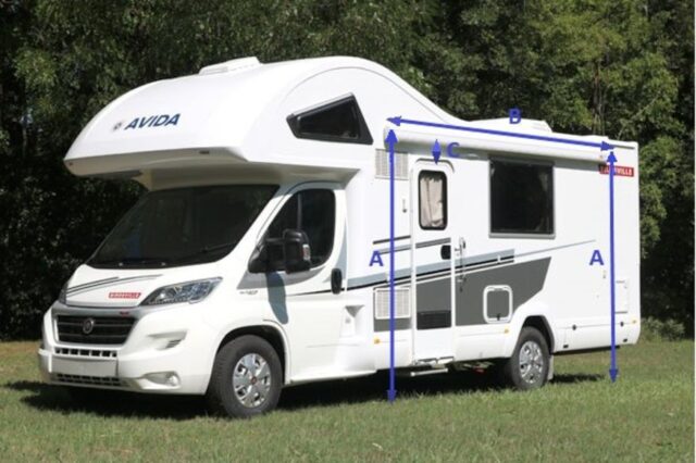First, make sure your motorhome is parked on a flat surface and is level. Next, get a tape-measure – and perhaps a pair of helping hands. Measure and note-down the following, referring to the above diagram to check what you’re measuring…