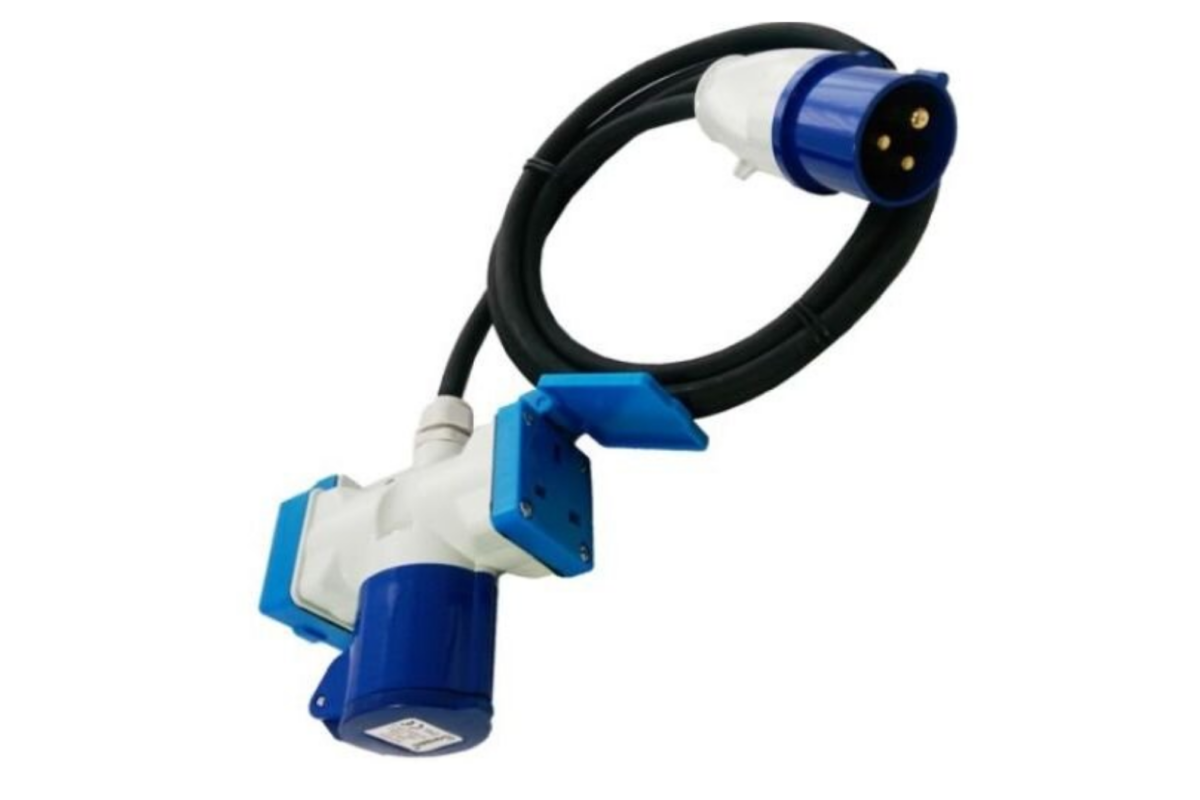 The lead features a professional-grade T-piece adaptor that includes two standard 13 Amp UK sockets and one high-capacity 16 Amp socket. Furthermore, this arrangement gives you flexibility in powering everyday equipment and heavier loads from a single feed. It’s ideal for workshop environments, leisure vehicles, or event rigs where one supply needs to serve multiple devices.