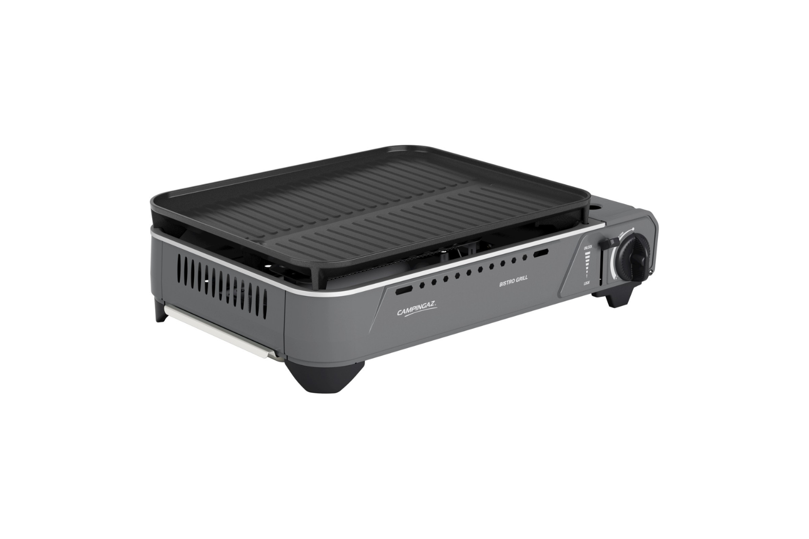 Built for convenience and reliability, the Campingaz Bistro Grill incorporates two automatic gas shut-off systems to cut flow or eject the cartridge if overheating occurs. Moreover, the stove includes a cartridge locking system to prevent gas leaks and a removable grease-drawer for fast cleaning. In addition, the four raised feet enhance stability and airflow beneath the unit, helping prevent overheating during use. Furthermore, you can pack it away in its recycled-plastic hard case once your cooking session ends.