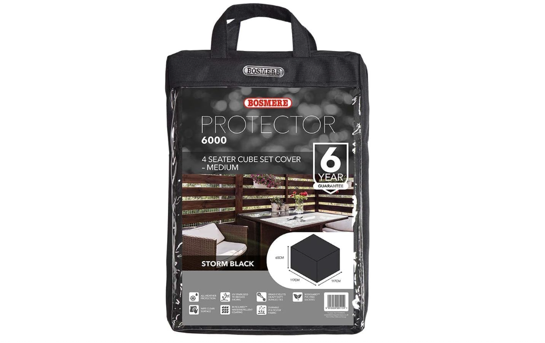 This Bosmere M645 Modular 4 Seater Cube Set Cover – Medium (Black) features water-repellent fabric with a PVC-free backing that promotes breathability. Moreover, UV protection helps shield your cube dining set from sun exposure. In addition, the tear-resistant structure withstands demanding outdoor conditions across seasons. Because of this, the Protector 6000 Cube Set Cover performs reliably through rain, frost and heat.