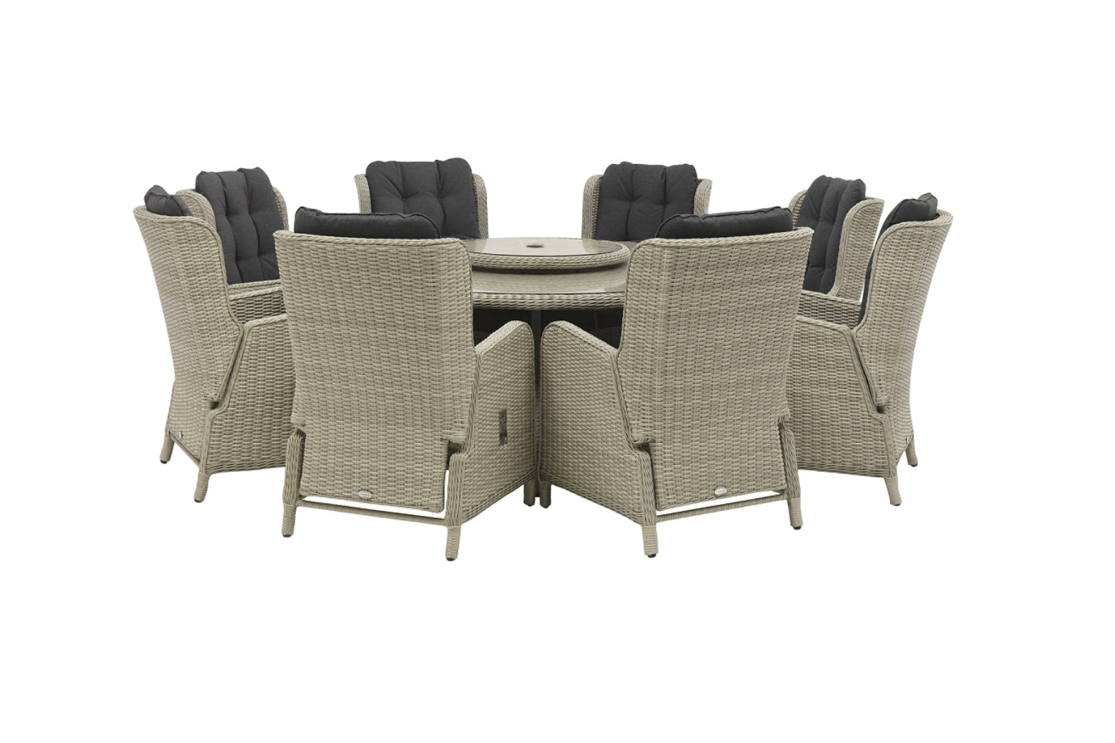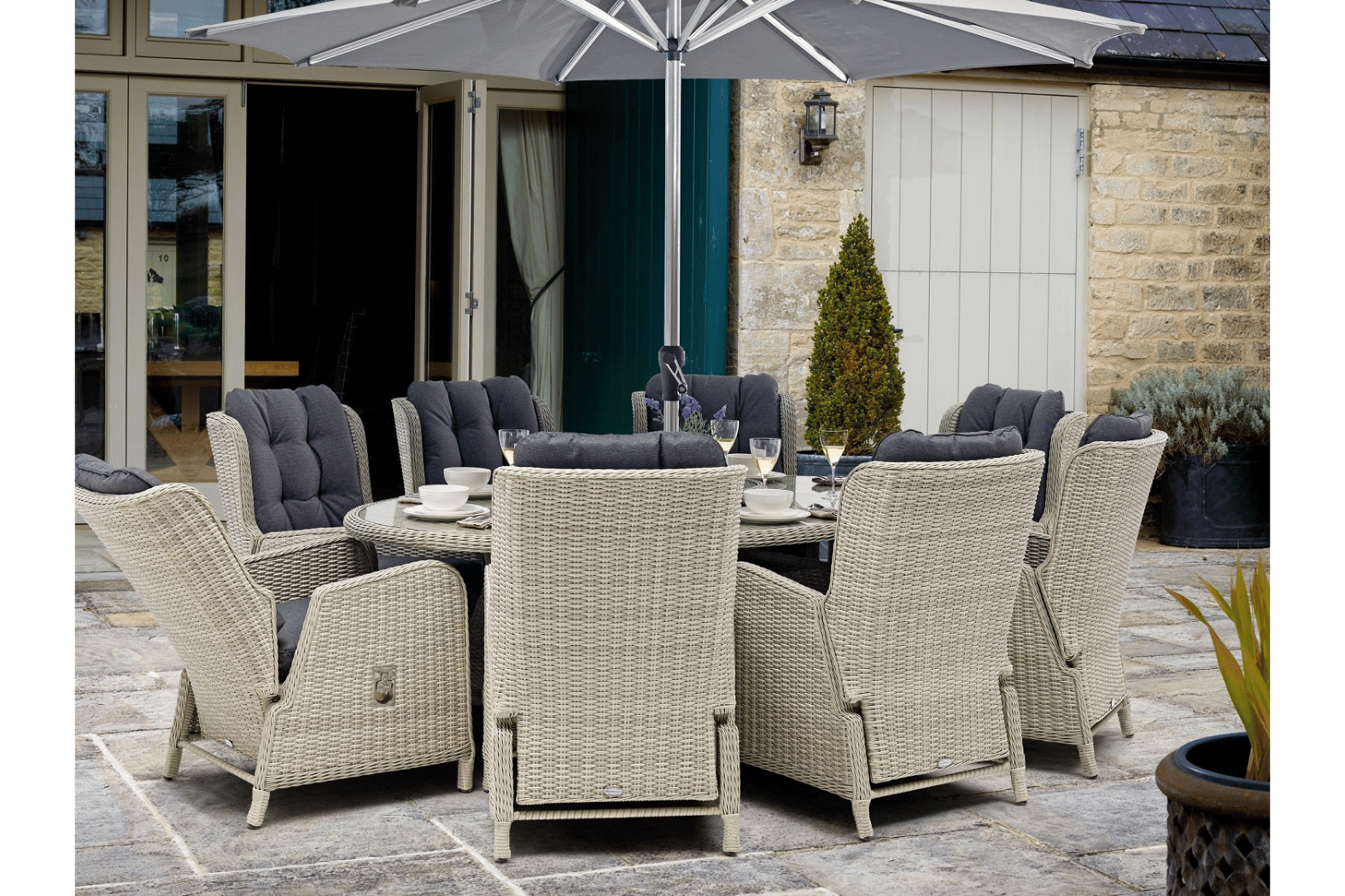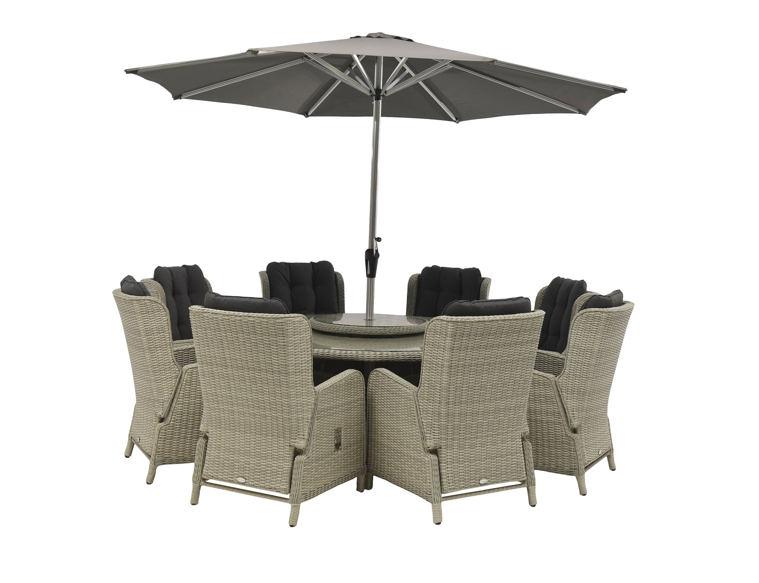 Bramblecrest Chedworth Reclining 8-Seat Round 180cm Dining Set with Lazy Susan, Parasol & Base – Dove Grey
