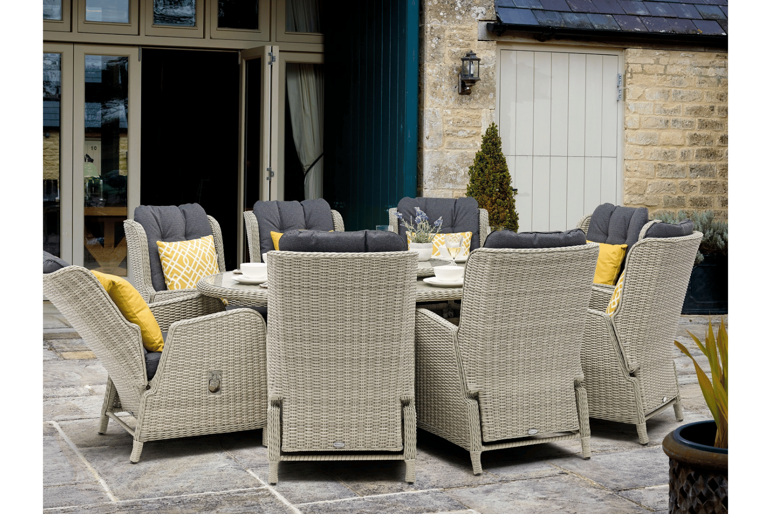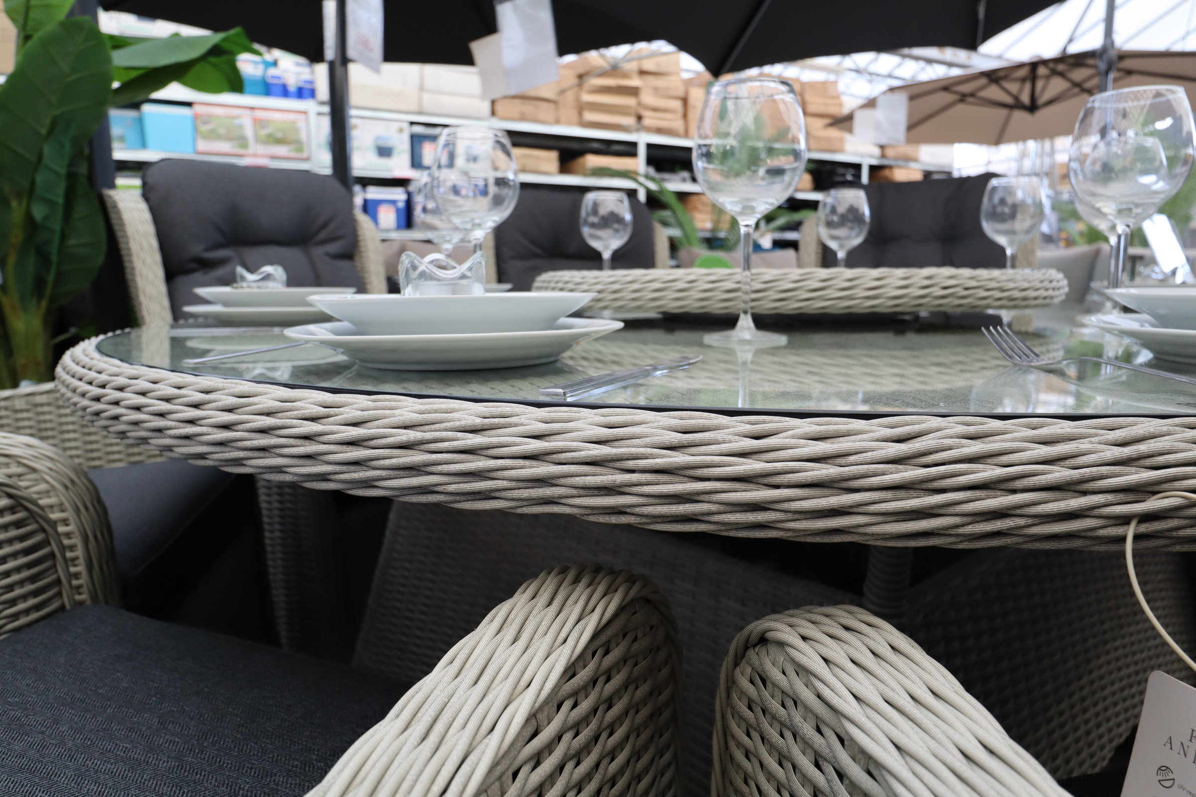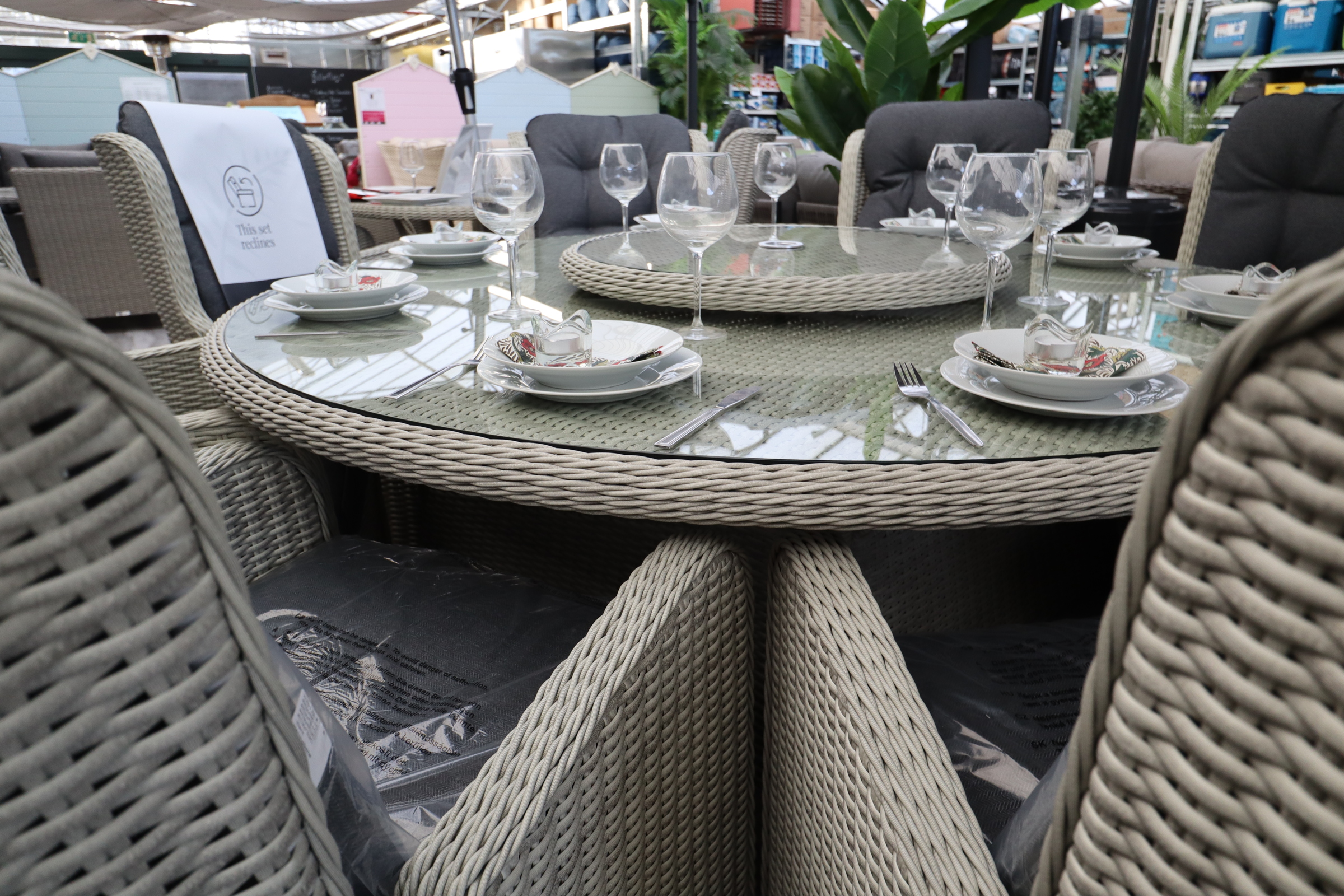 Bramblecrest Chedworth Reclining 8-Seat Round 180cm Dining Set with Lazy Susan, Parasol & Base – Dove Grey