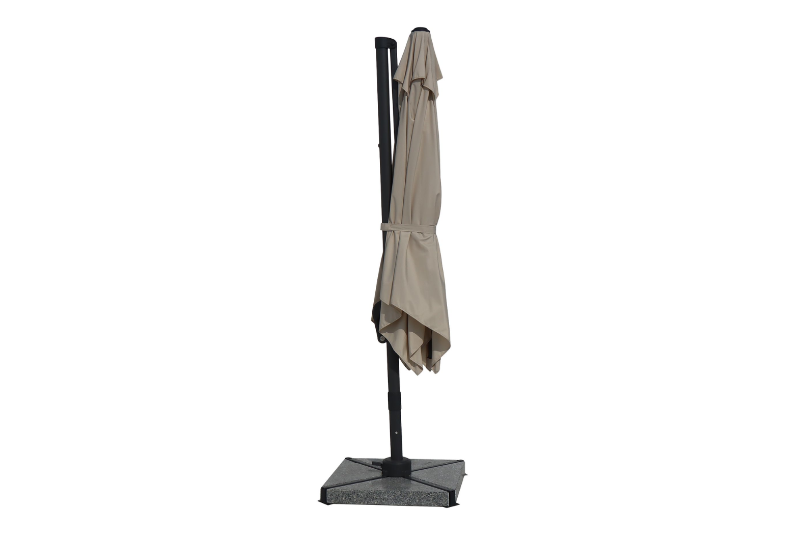 The parasol’s frame is made from rust-resistant powder-coated aluminium. As a result, it stays strong and stable even when exposed to damp or changeable weather. Moreover, the package includes a 90kg Wheeled granite base which anchors the parasol firmly. This ensures stability — important considering the broad canopy — even when there’s a breeze.