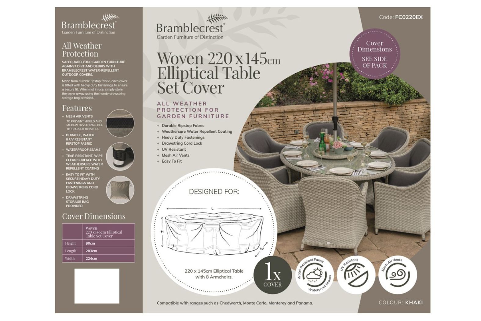 The premium Bramblecrest Woven 220x145cm Elliptical Table Cover designed to protect the woven 220x145cm elliptical table set with ease and style. This cover offers tailored, durable protection for your furniture and keeps it ready for use in all seasons.