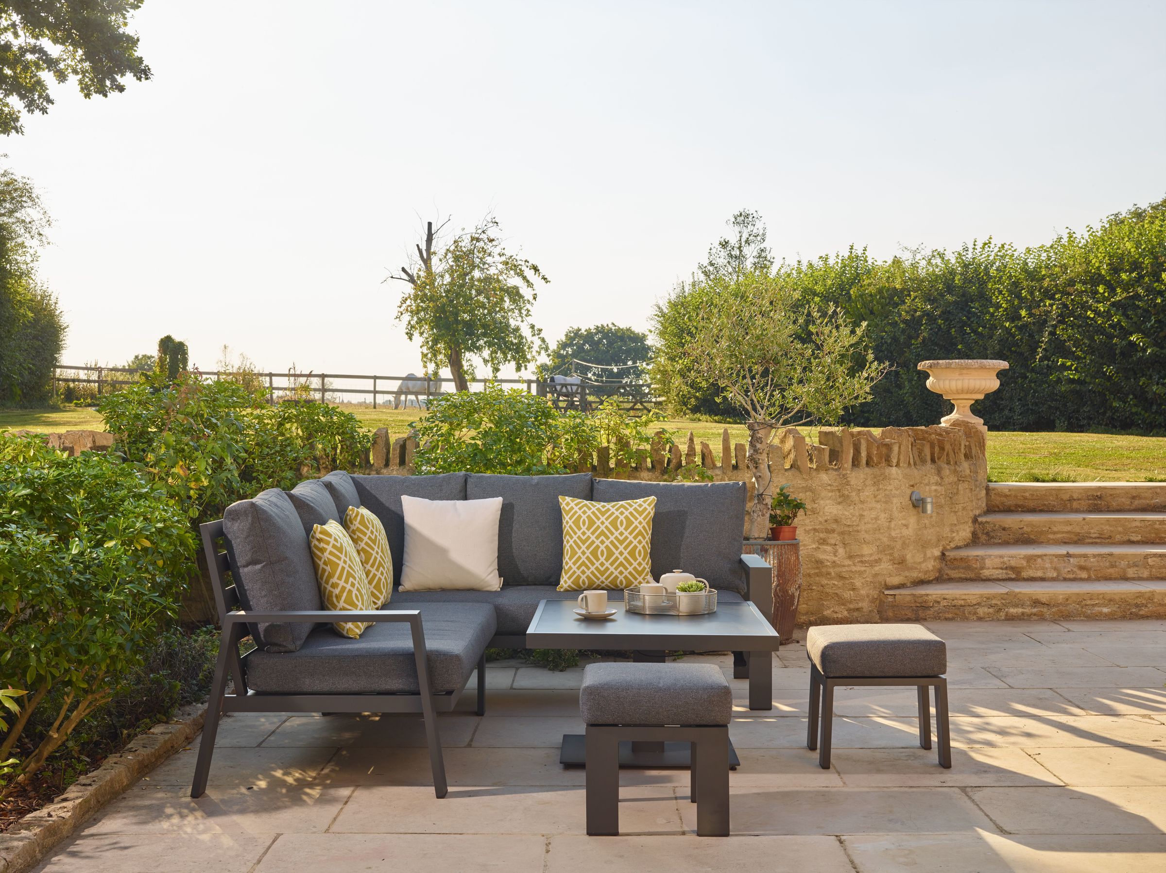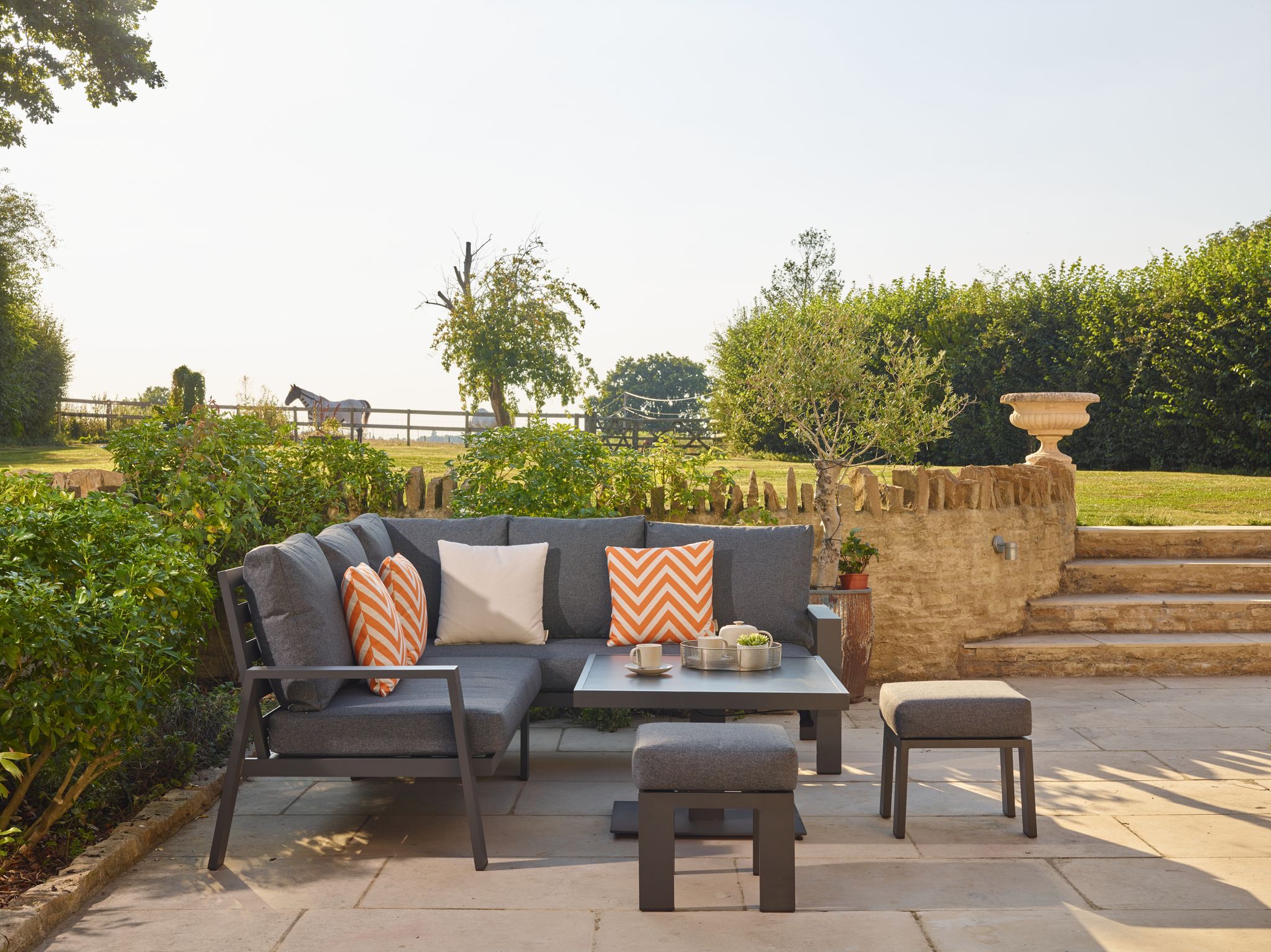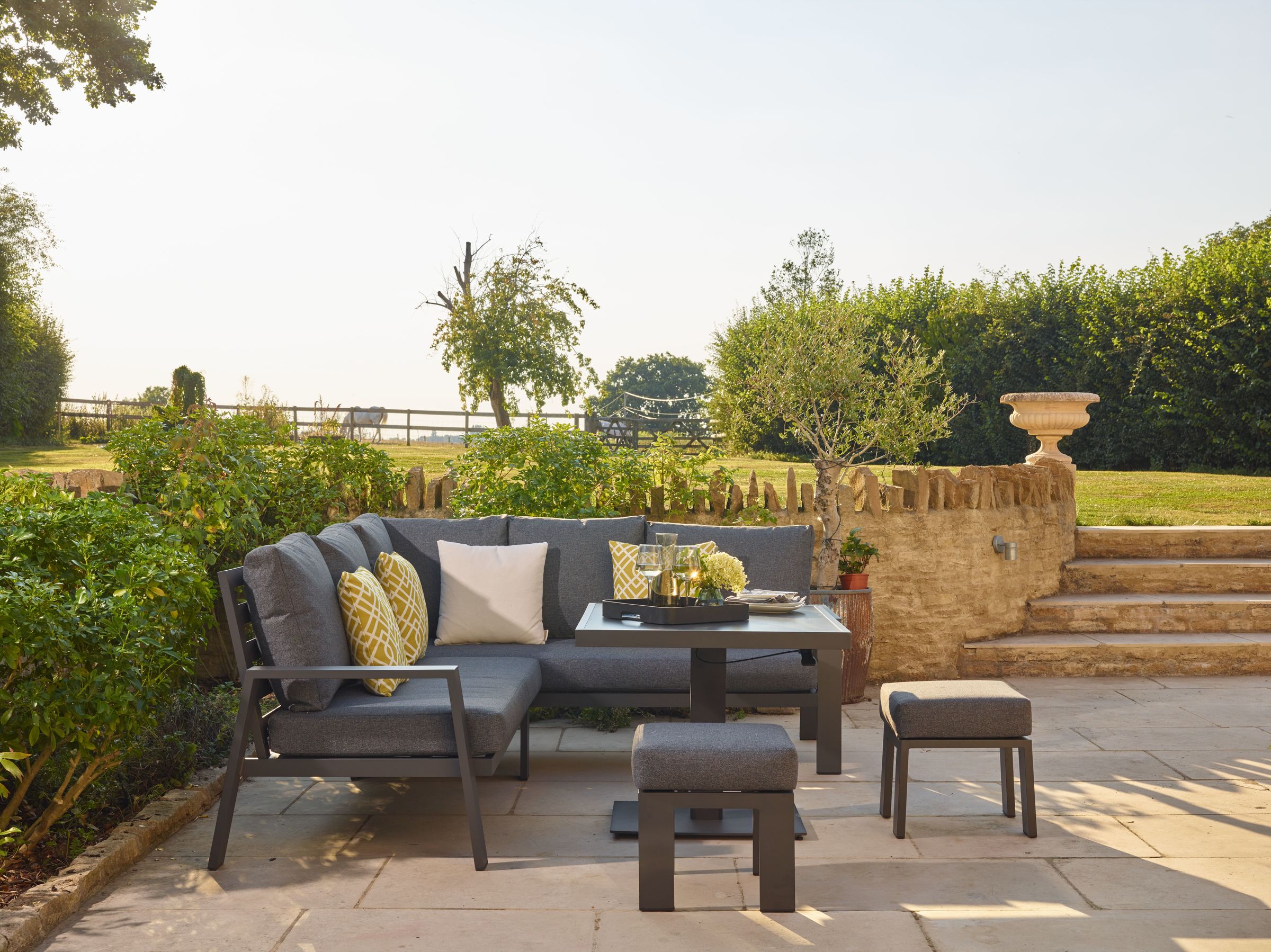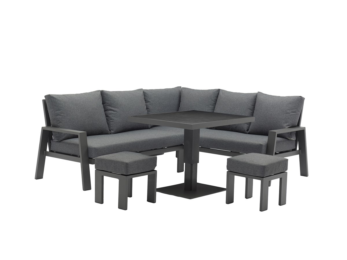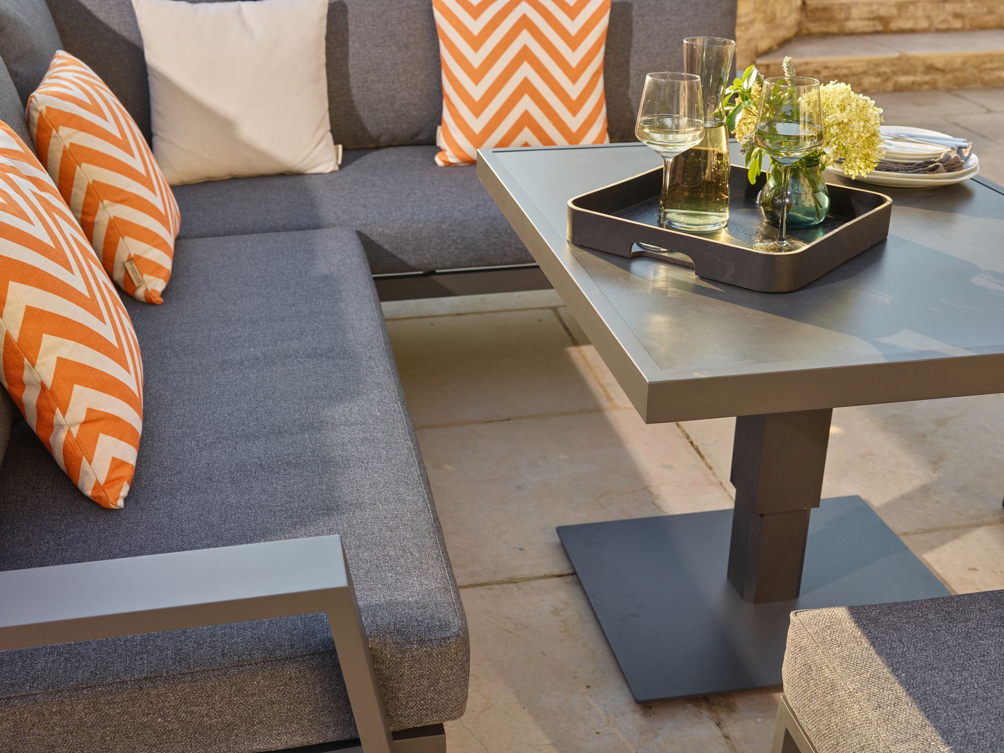 This contemporary Bramblecrest Amsterdam Mini Corner Set with Adjustable Hi-Low Table provides the ultimate stylish entertaining experience.