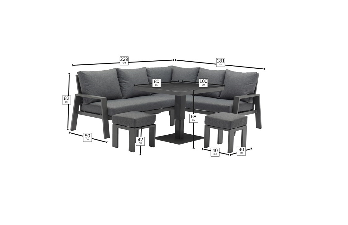 Compact, dark and attractive; this corner-hugging set is ideal for entertaining small groups. The innovative height-changing table is designed with aesthetics and functionality in mind, one can raise and lower it with the intuitive lever control. A versatile set covering all your alfresco options, the table can be lowered for morning coffee or raised for meals. Unwind and relax on the sofa or perch on the handy stools which can be tucked away when not in use.