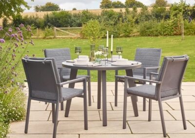 The stylish dark tones of the Amsterdam range would add a modern touch to a wide variety of outdoor spaces. Cushions in recycled plastic bottle fabric add an Eco-friendly touch to this contemporary set. This set is easy to maintain with a wipe-clean ceramic glass table top. Rust-free aluminium frames provide peace of mind for long-term use, and the collection is also lightweight, so can be moved around your spaces easily.