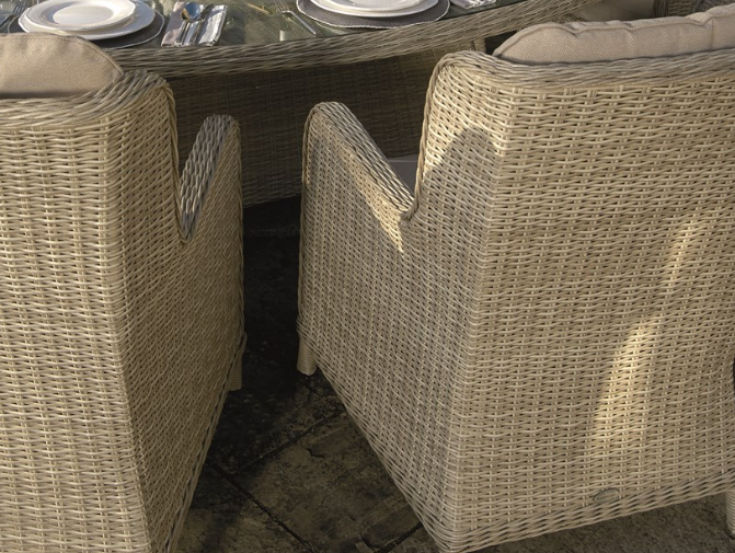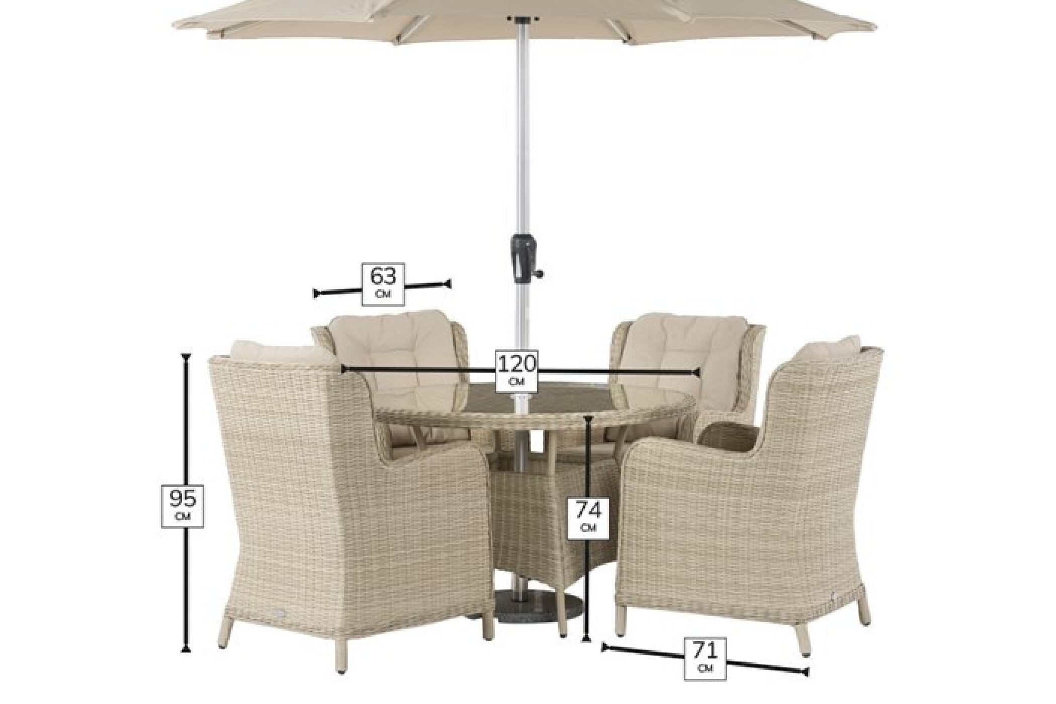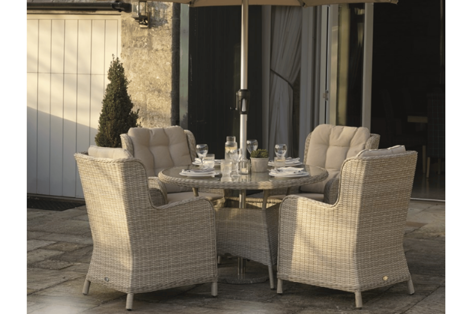 Each dining chair in the Chedworth 4-Seat Round Dining Set – Sandstone comes with season-proof Herringbone Barley cushions. These cushions are water-repellent, UV-resistant, and stain-resistant, maintaining their plush look throughout the year. Moreover, the all-weather rattan requires minimal maintenance. In addition, the sturdy parasol provides essential shade on sunny days, keeping your dining space cool and comfortable.