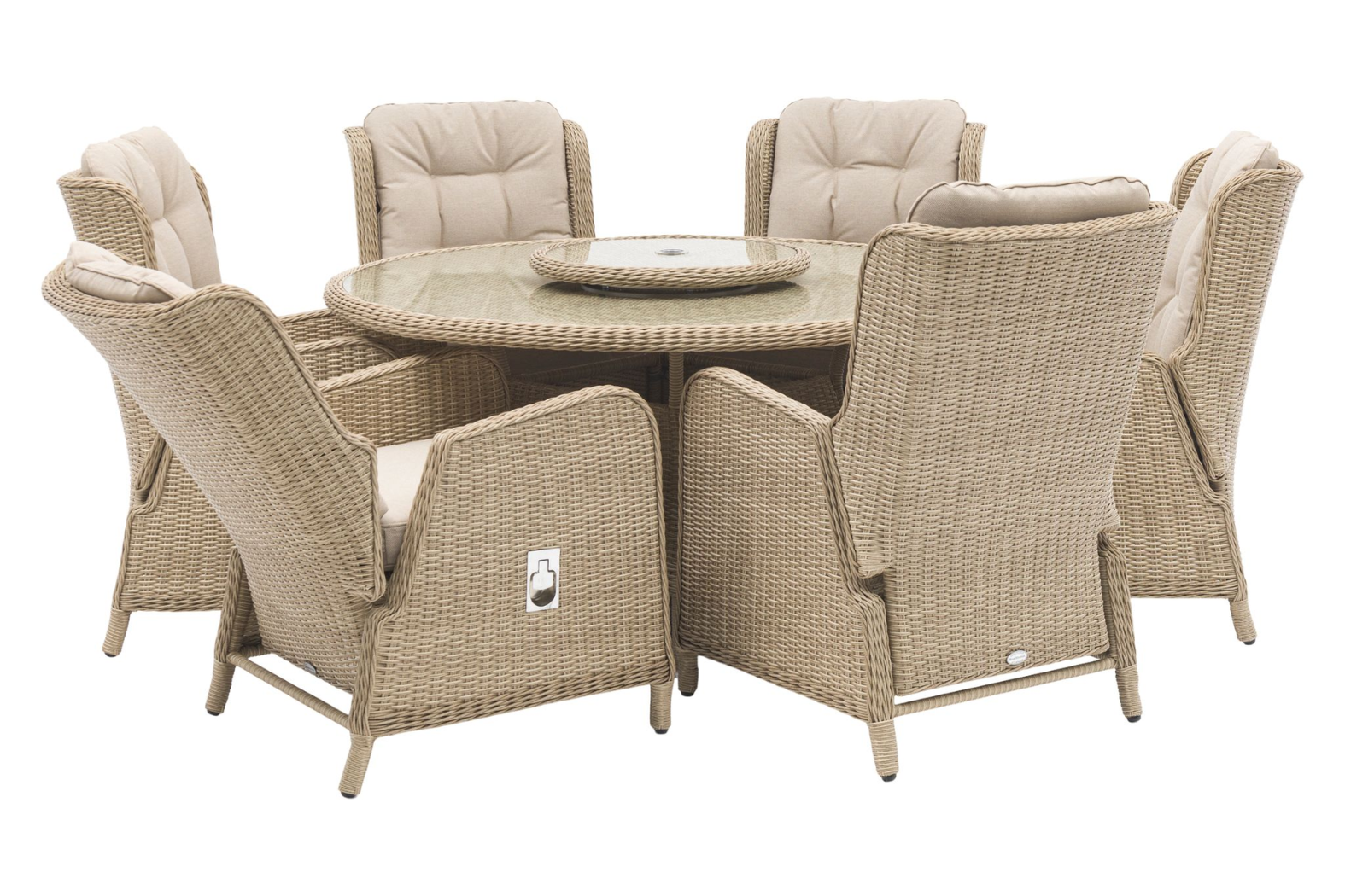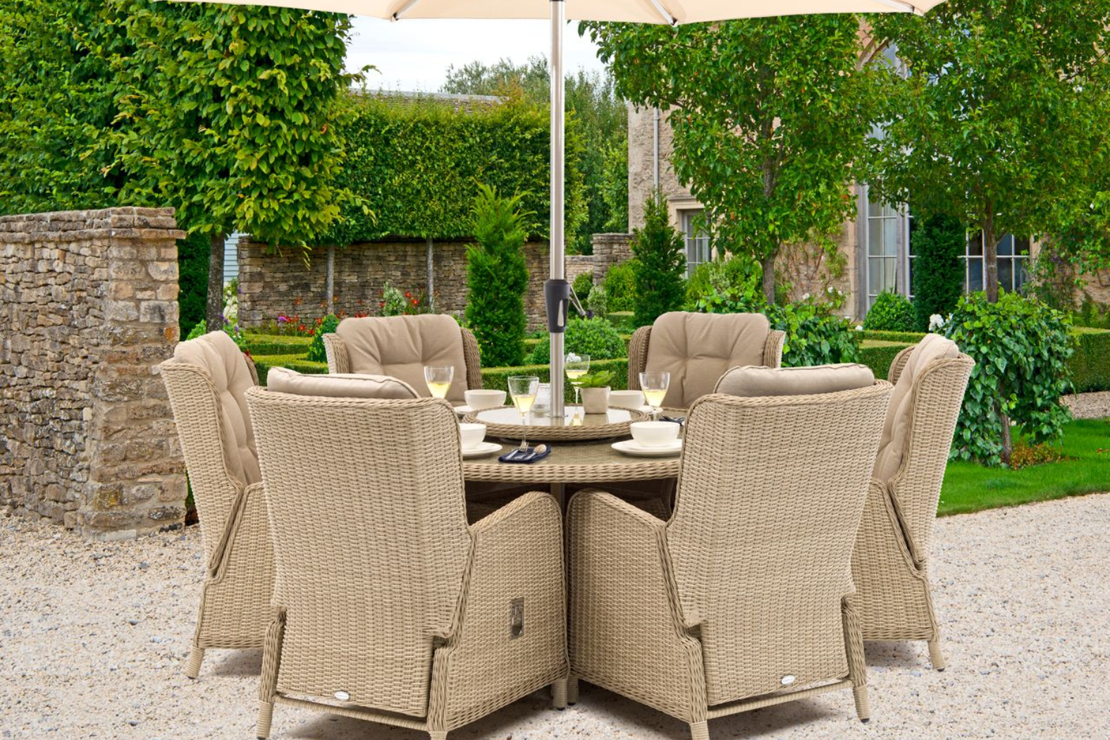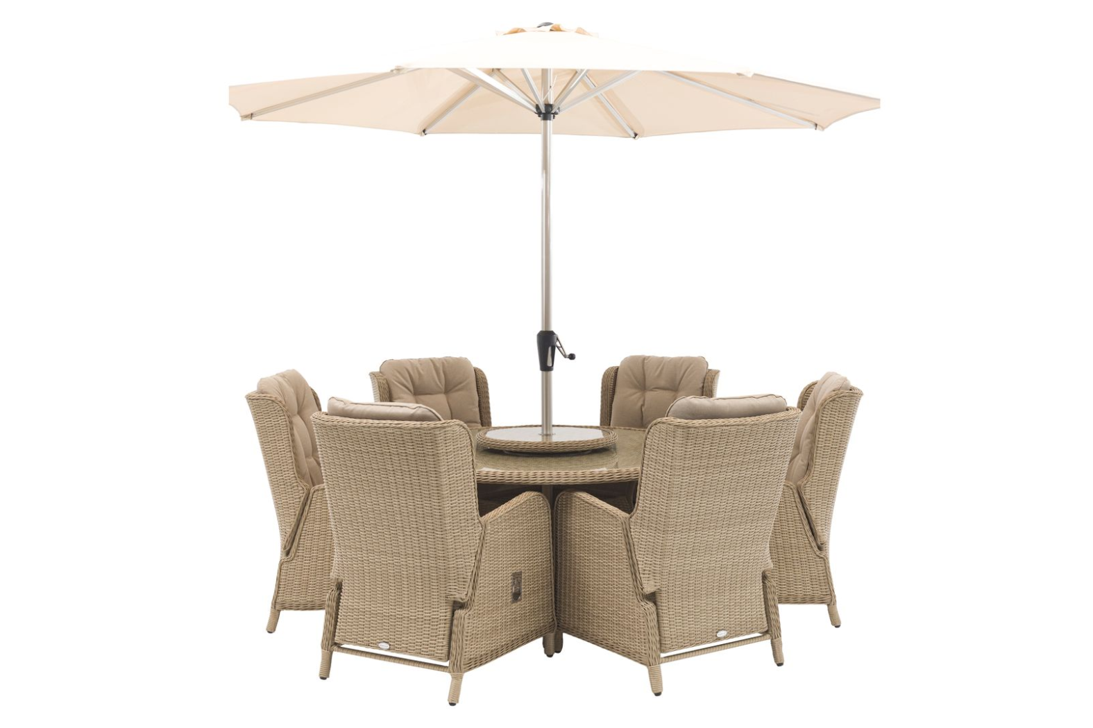 Bramblecrest Chedworth 6-Seat Round 150cm Exclusive Dining Set with Lazy Susan, Parasol & Base – Sandstone