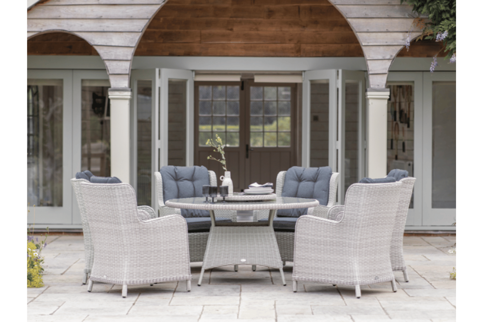 The Bramblecrest Chedworth range is a premium collection with timeless style. The table-tops are all made of ceramic or tempered glass, making them sturdy, simple to clean and suitable for year-round use. For added comfort, the seat bases and backs of the chairs feature deep-filled cushions.