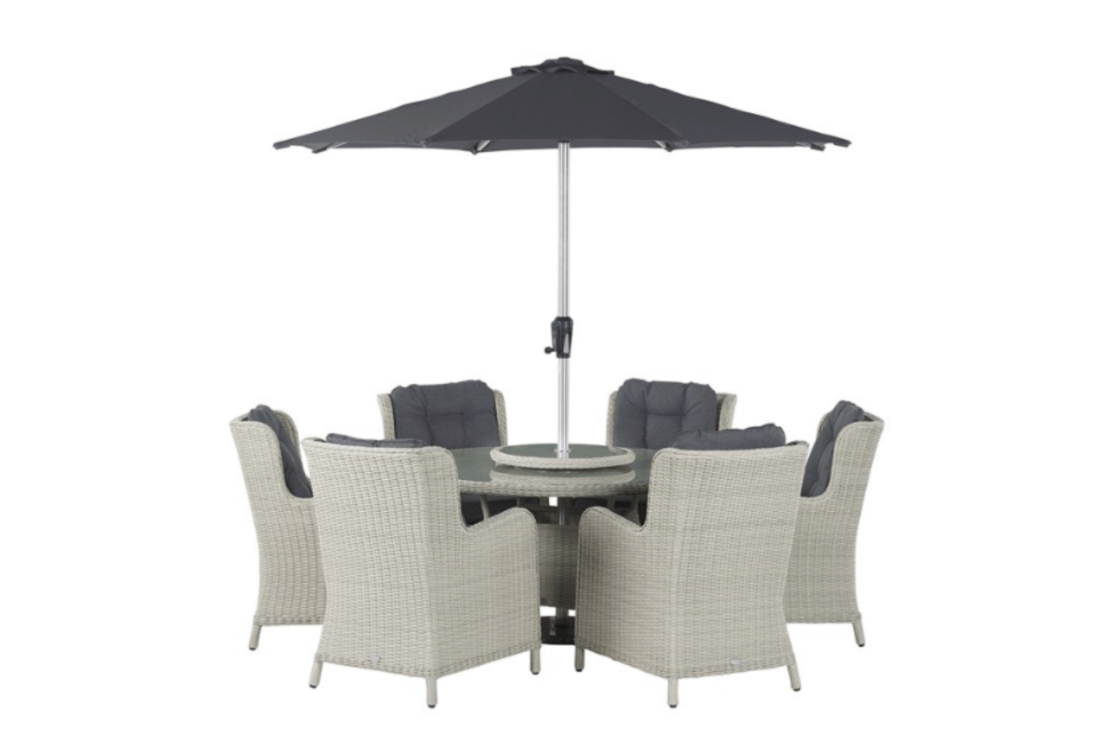Bramblecrest Chedworth 6-Seat Round 150cm Dining Set with Lazy Susan, Parasol & Base – Dove Grey Features: