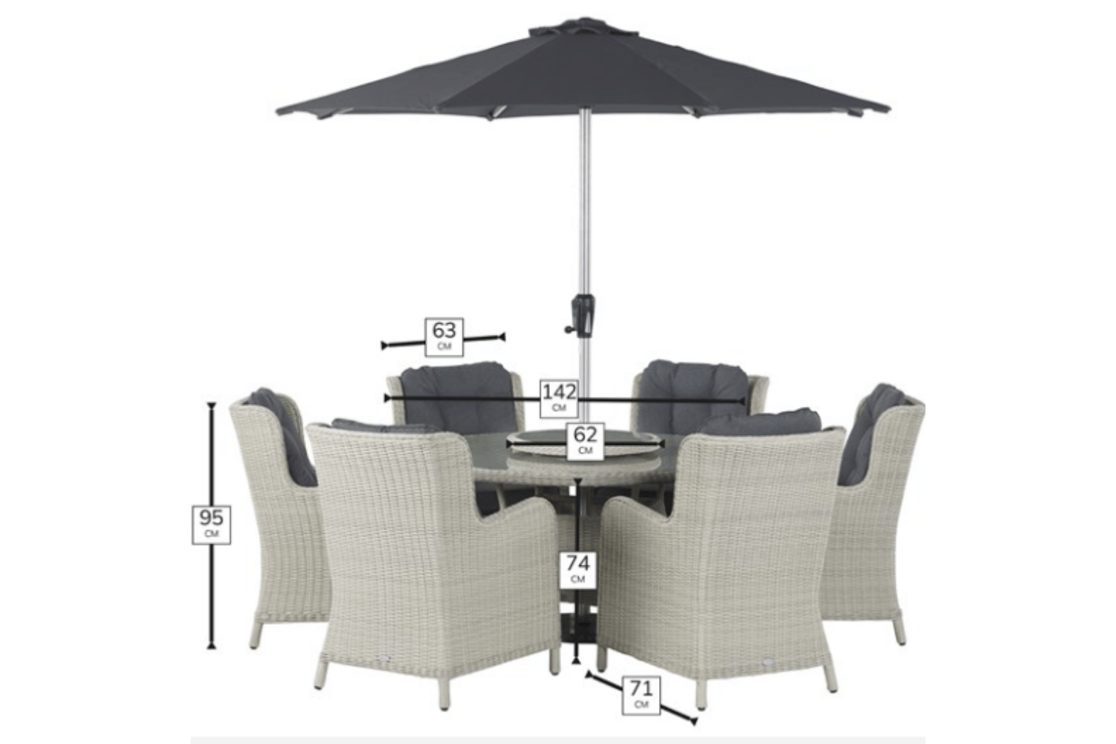 The eye-catching combination of the skirting on the round table and the curved lines of the indulgent high-back armchairs are sure to add sophistication to your supper for six. Co-ordinating cushions in Herringbone Dusk-colour add texture and comfort in equal measure. A removable Lazy Susan self-server, 3m brushed aluminium round crank-handle parasol and 15kg granite base complete the set.
