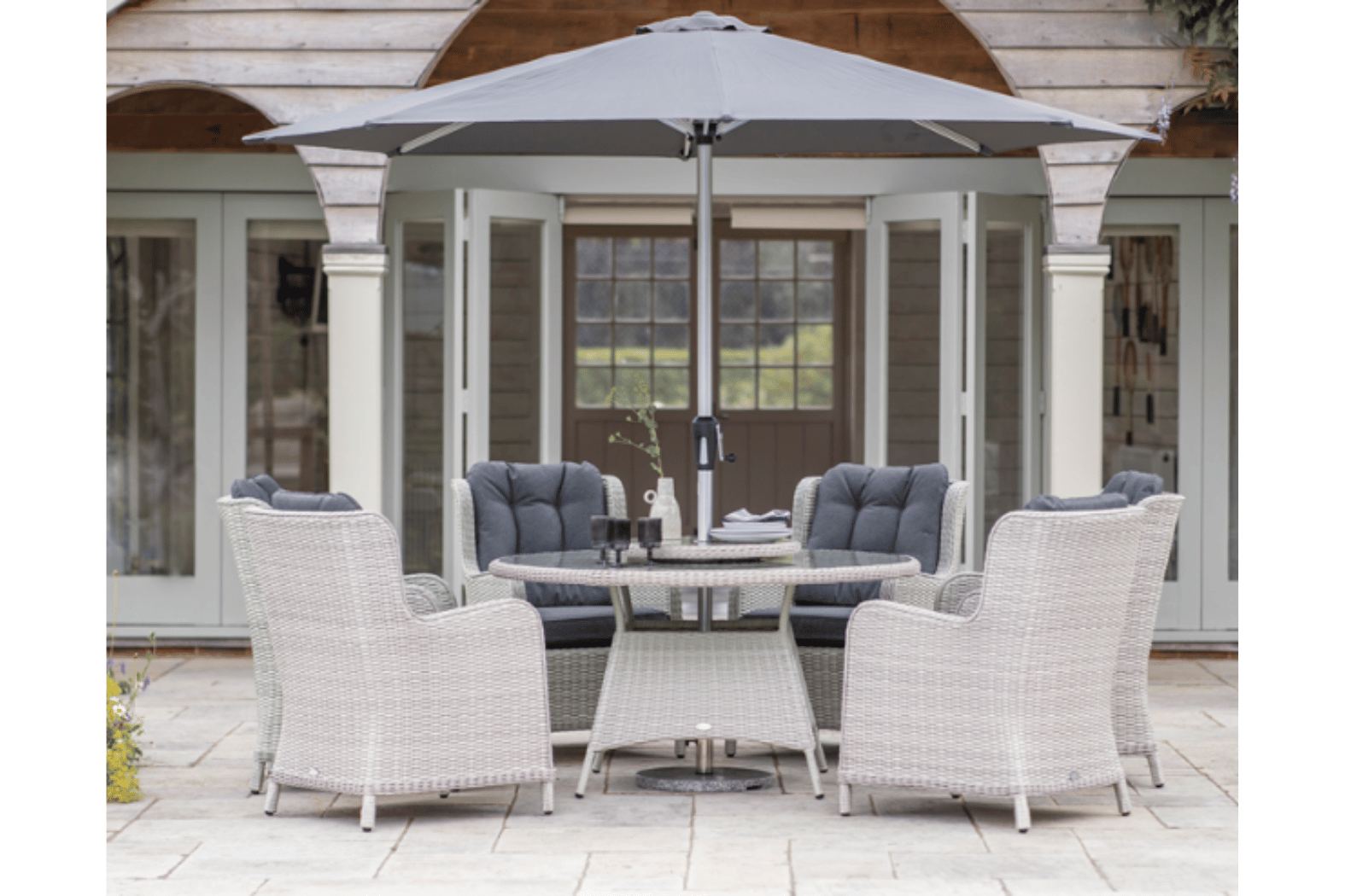 Bramblecrest Chedworth 6-Seat Round Exclusive 150cm Dining Set with Lazy Susan, Parasol & Base – Dove Grey