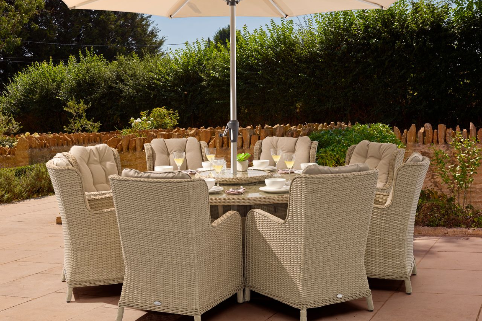 The Bramblecrest Chedworth 8-Seat Round 180cm Dining Set – Sandstone brings both style and function to your patio. It centres around an elliptical table with a recessed glass top, which enhances protection and creates a sleek look. In addition, the 60 cm Lazy Susan turns effortlessly, making it easy for everyone to share dishes without reaching across the table. As a result, meals feel more connected and sociable.