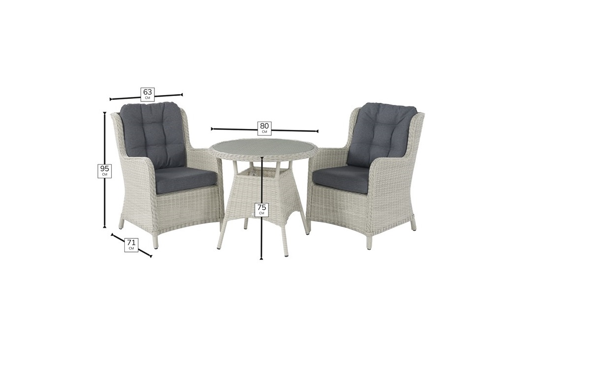 Crafted with rust-free aluminium frames, this bistro set ensures stability and long-term use. Moreover, the recessed glass tabletop resists scratches and is easy to clean. In addition, the maintenance-free Dove Grey rattan weave brings warmth and style to any garden. Furthermore, its high-back chairs combine ergonomic support with timeless design, providing comfort for leisurely outdoor moments.