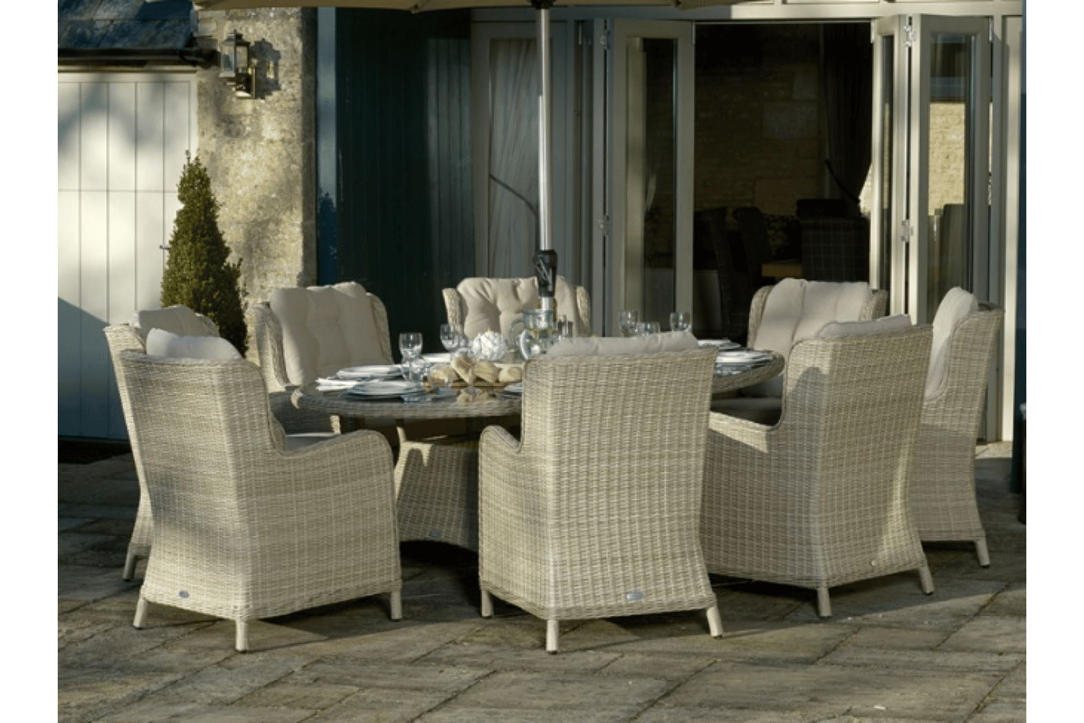 An invitation to dine as well as unwind, this collection will ensure that you make the most of those magical midsummer evenings and laid-back barbeque days. And the shapely design of the elliptical table adds a simple, yet sophisticated touch to your outdoor dining. Enjoy sublime seating in high-back dining armchairs, with matching 60cm Lazy Susan self-server, 3m brushed aluminium round crank-handle parasol and 15kg granite base to complete this sociable set for eight.