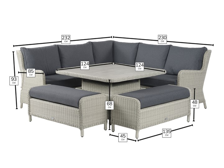 – Dimensions (cm). Sofa: H93 x W/D85 x L230 x 232, Table: H68 x W/D122 x L122, Bench: H48 x W/D45 x L115