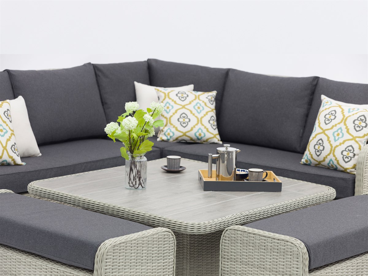 Meal time or me time. This reclining corner sofa set ticks both boxes; enjoy a lazy lunch and simply recline the sofa to indulge in a sneaky afternoon snooze. With its clever height-changing table, you can switch from low level morning coffee mode to dining height in an instant. Two smart padded benches add to the versatility of this stylish set.