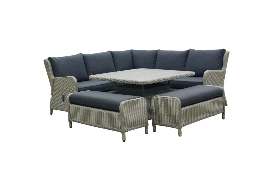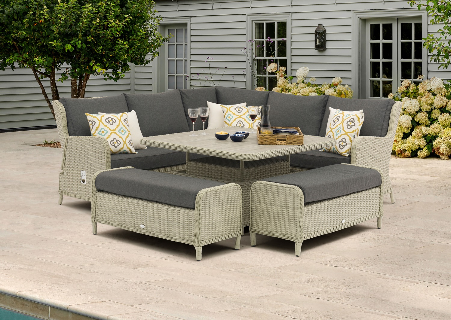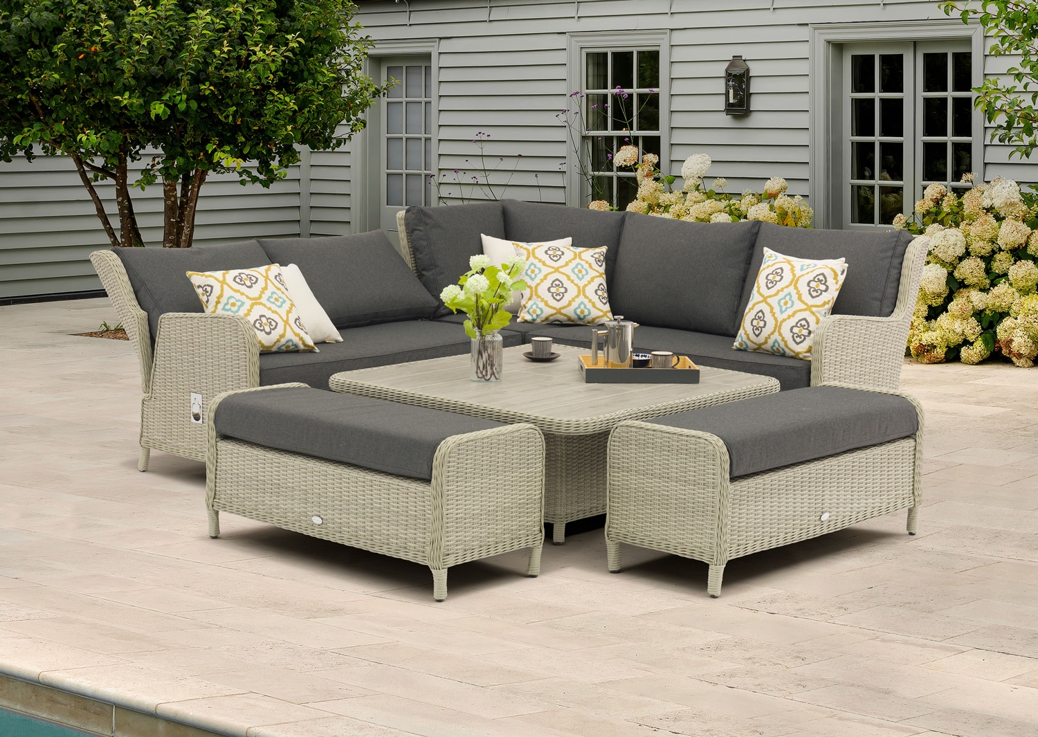 A pleasing blend of traditional rattan design with added detail, the Bramblecrest Chedworth High/Low Corner Set with Reclining Back – Dove Grey offers exceptional style and elegance.