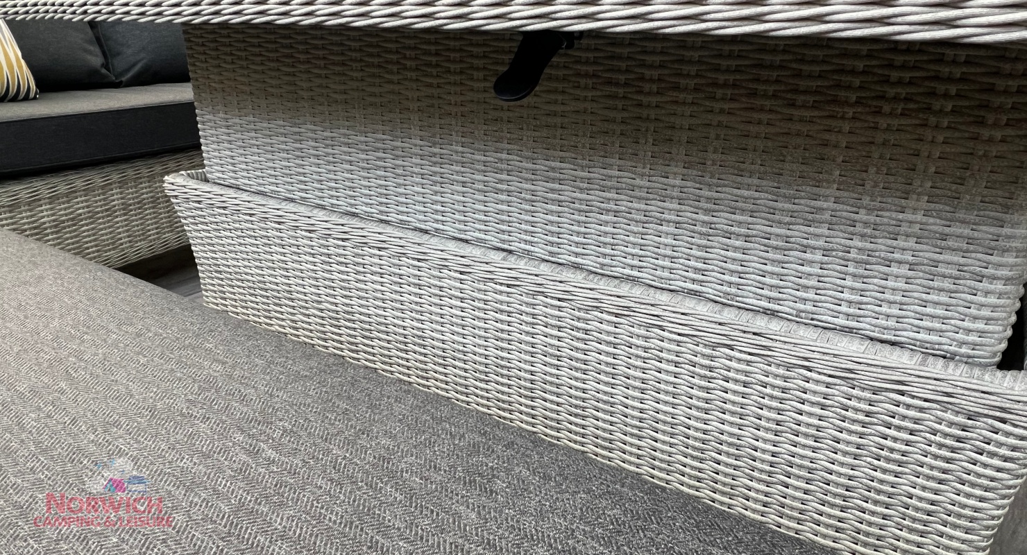 This L shaped sofa with its clever height-changing table, you can switch from low level morning coffee mode to dining height in an instant. Two smart padded benches add to the versatility of this stylish set. There’s plenty of room for guests thanks to the spacious seating options, including one larger and one standard size padded bench.