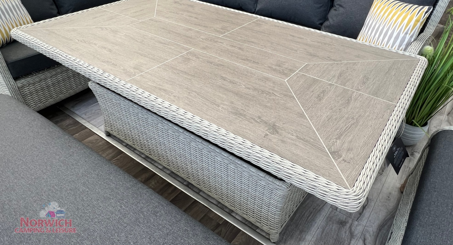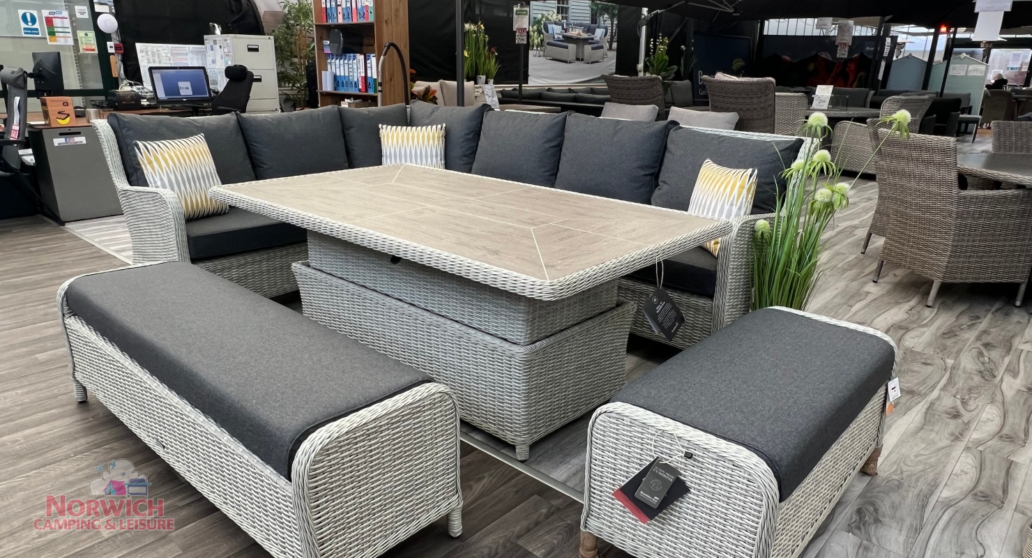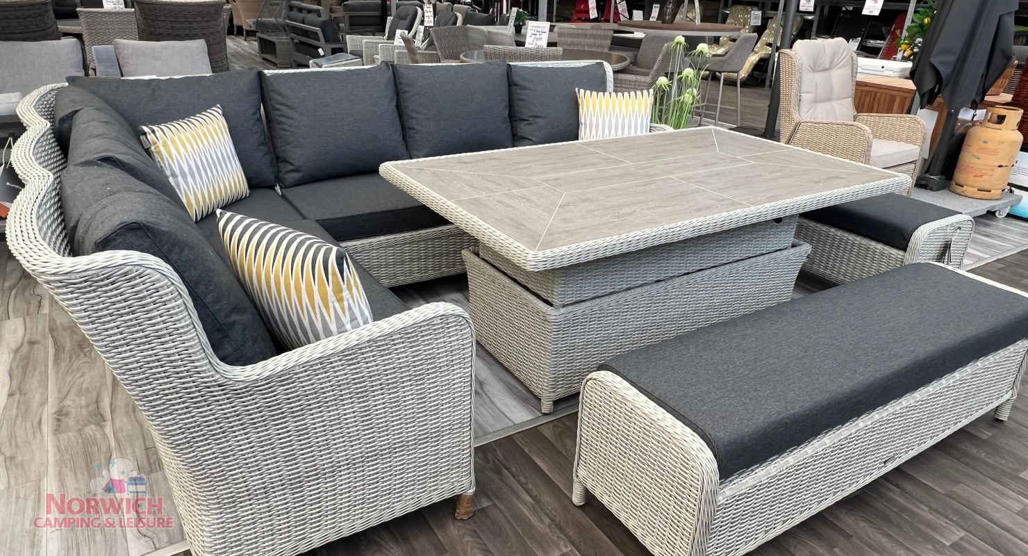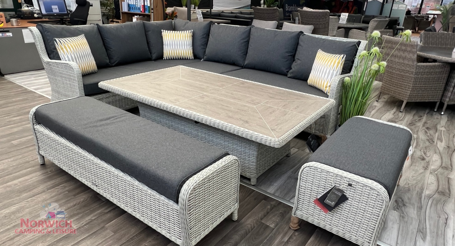 Extend your alfresco dining season with this Bramblecrest Chedworth L-Shape Sofa with Large Rectangular Ceramic Hi-Low Piston Table & 2 Benches – Dove Grey.