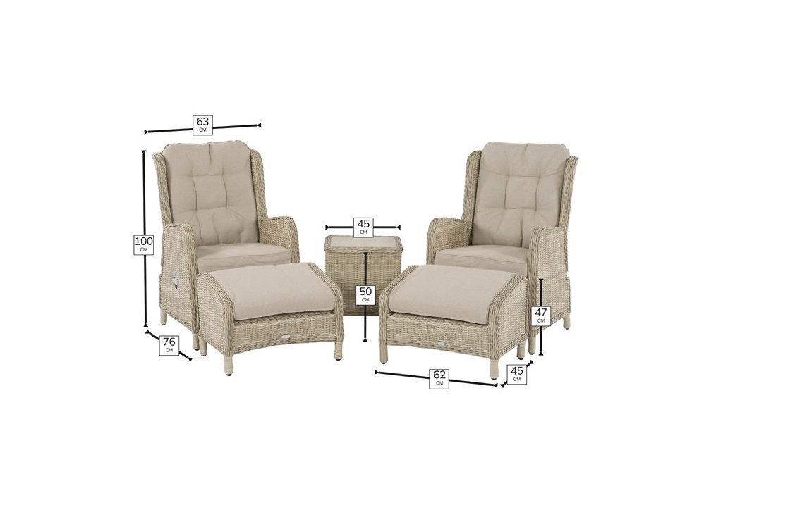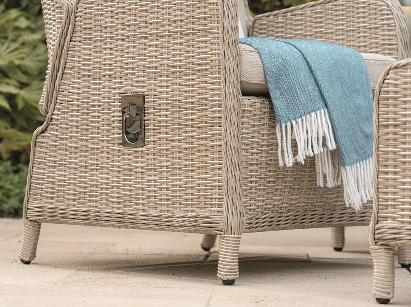 Relax in laid-back luxury with this stylish and elegant reclining set. The smooth reclining mechanism allows you to sit up or lie back at any angle – simply pop your feet on the padded footstools and grab a glass from the handy coffee table. Pure post-gardening bliss. The all-weather Sandstone rattan is built on an aluminium frame, hence the furniture is strong and rust-free. Soft-touch, Herringbone Barley cushions are made from our quality season-proof fabric which is water, stain and frost-resistant. The square coffee table features a durable, ceramic top which is recessed into the weave for added protection and aesthetics. Smooth, piston-operated reclining mechanism