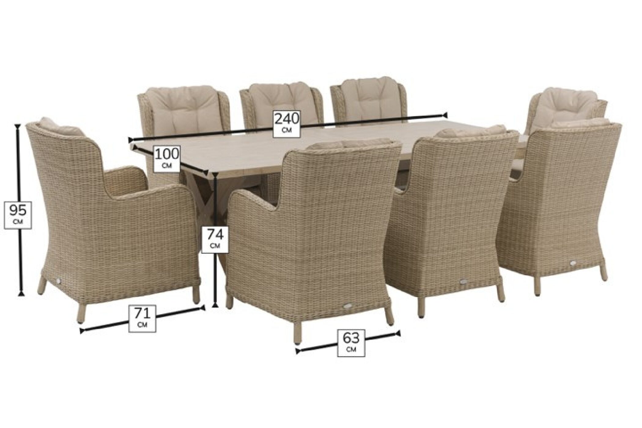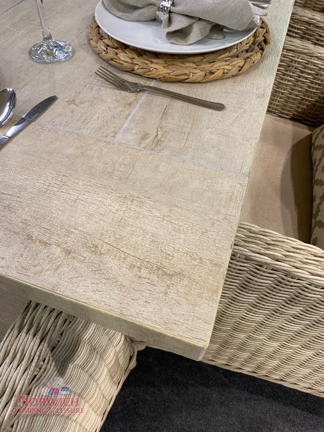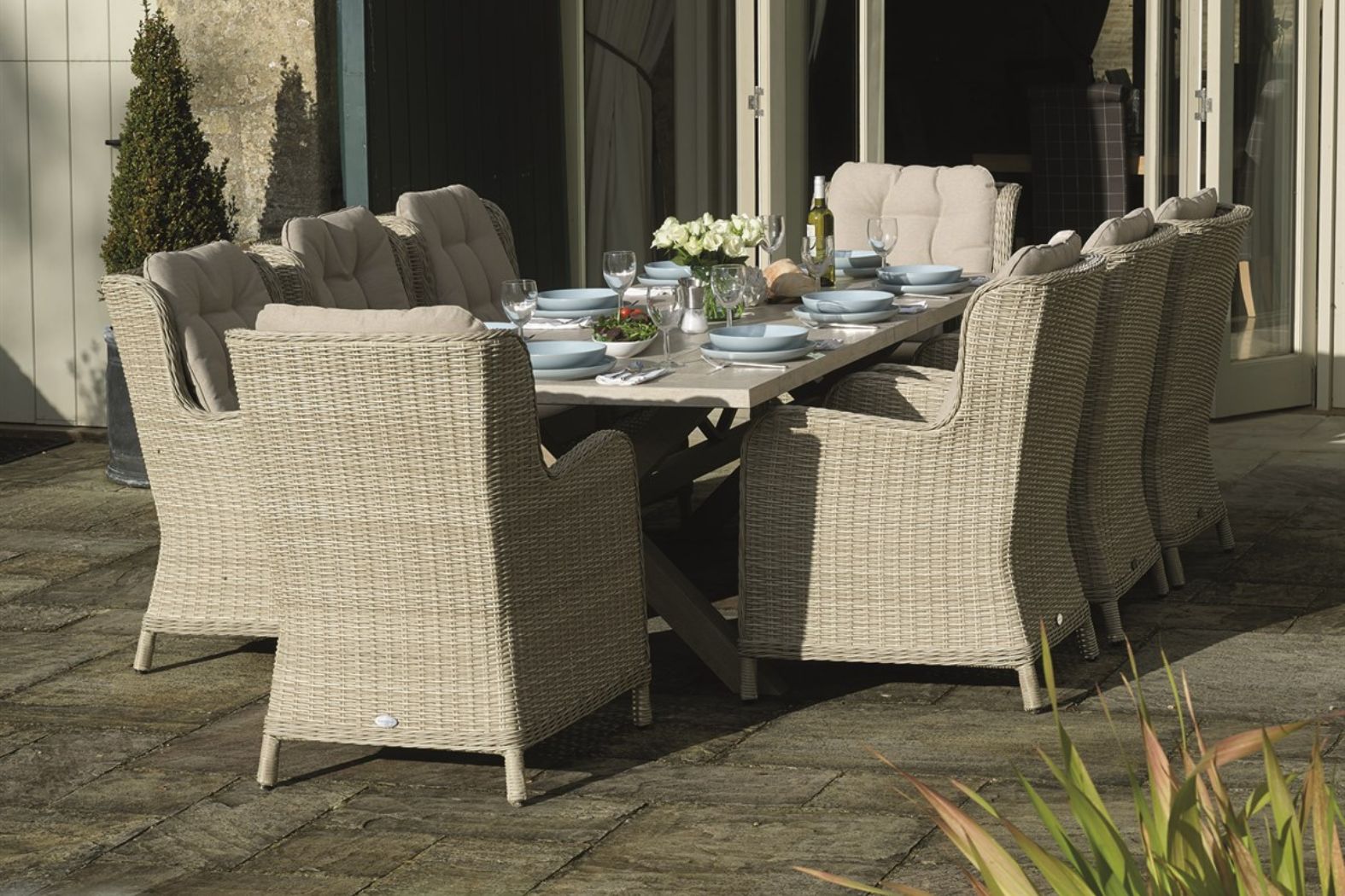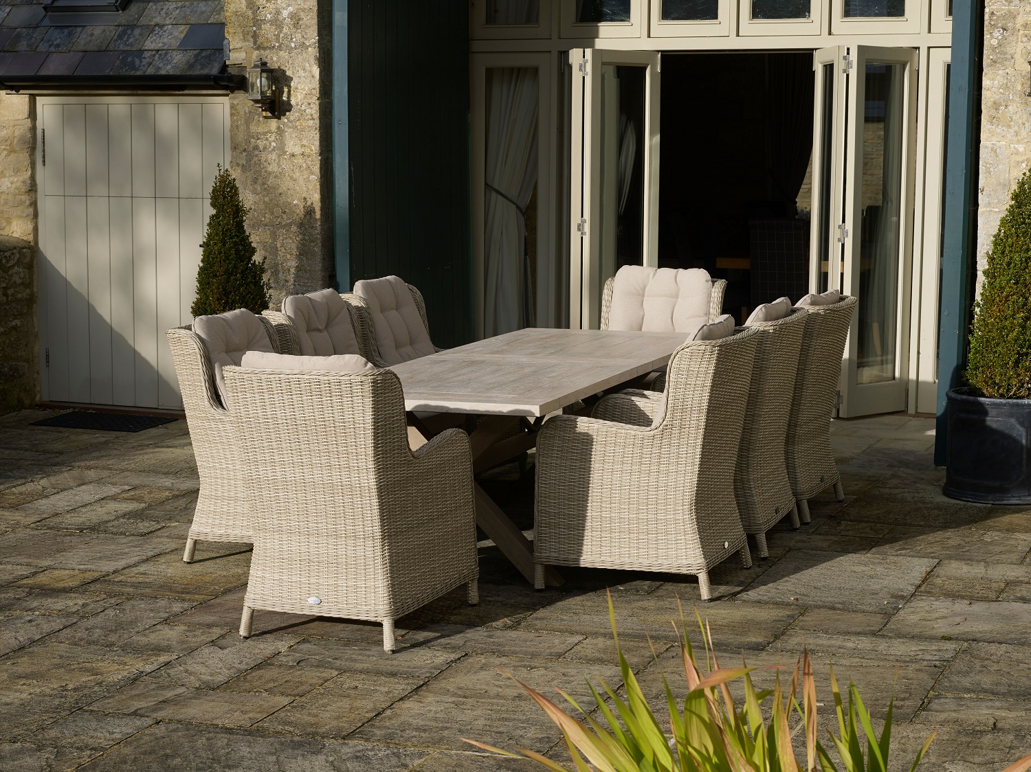 High in style but low in maintenance, this eight seat dining set boasts a ceramic wood-effect refectory table and sublime high-back armchairs. Guests can be seated in style and comfort on the Sandstone outdoor rattan dining chairs, complete with season-proof cushions in a tasteful Herringbone Barley fabric. The natural tones of this set complement any surrounding – indoors or out.