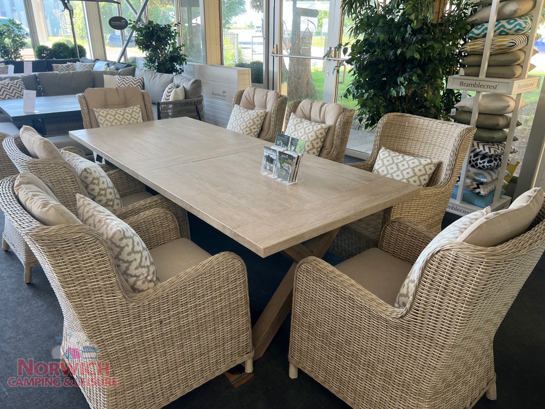 Bramblecrest Chedworth Rectangular Ceramic Table & 8 Chairs – Sandstone Features: