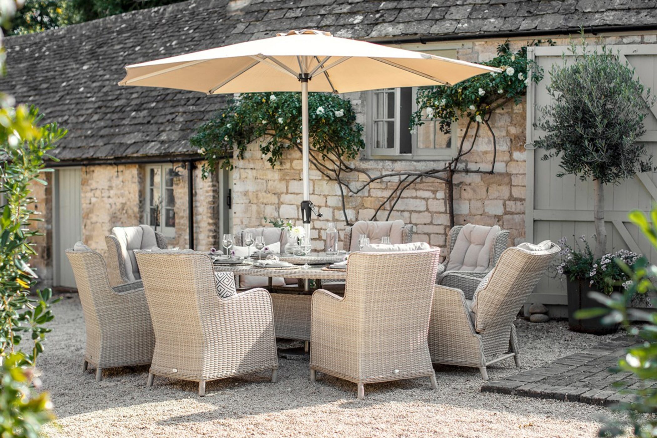 The Bramblecrest Chedworth Sandstone 8-Seater Elliptical Dining Set (including 2 Recliners) with Lazy Susan, Parasol & Base features a pleasing blend of traditional design with added detail for exceptional style and elegance.