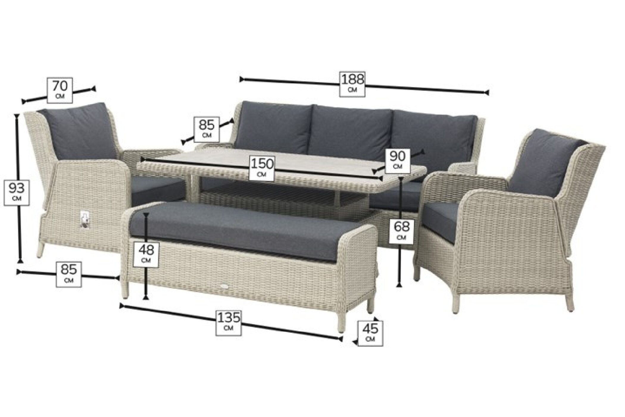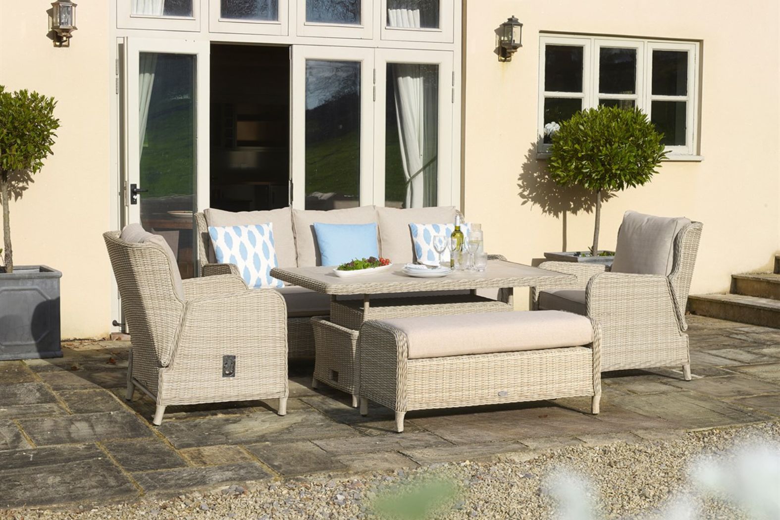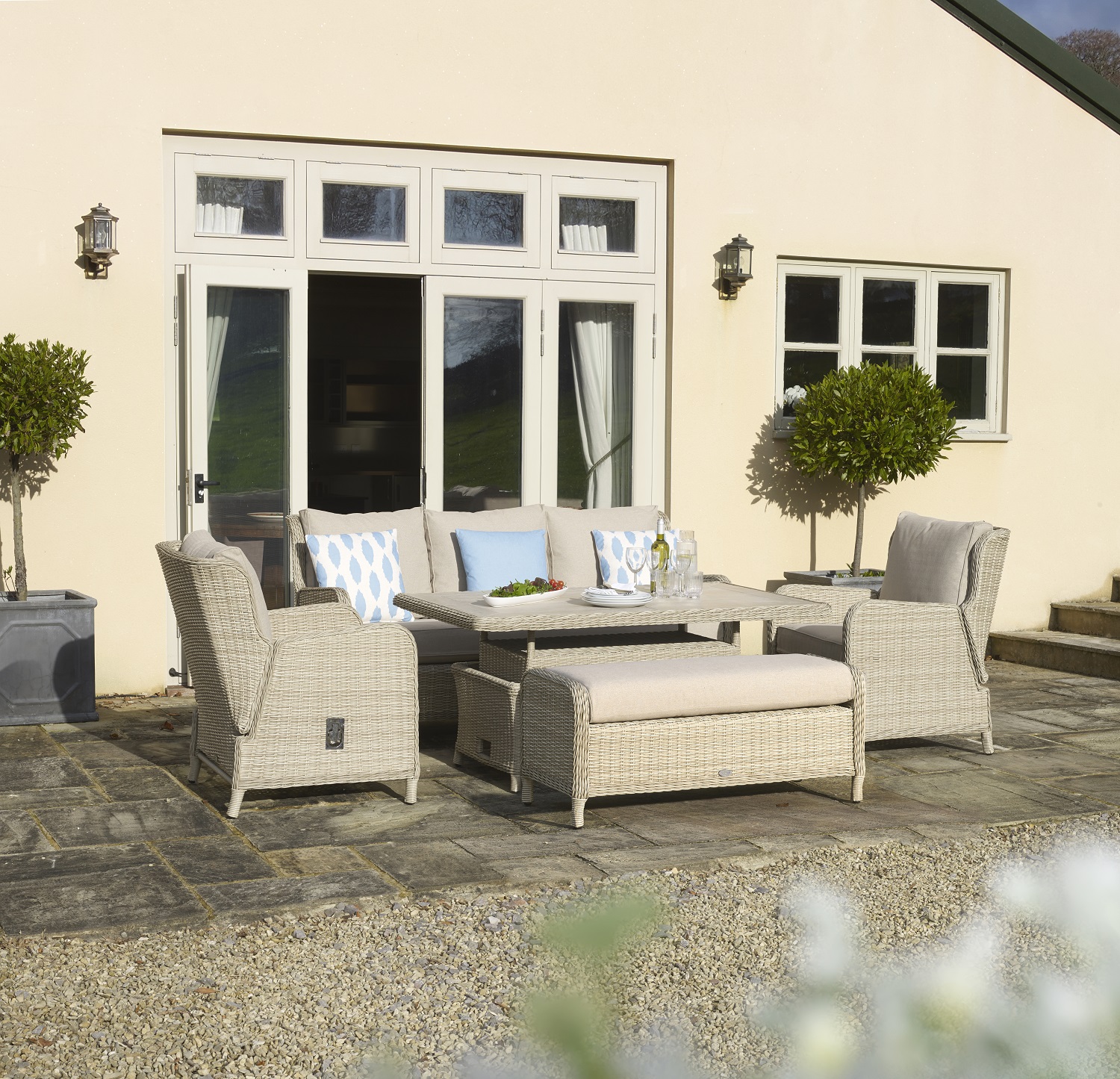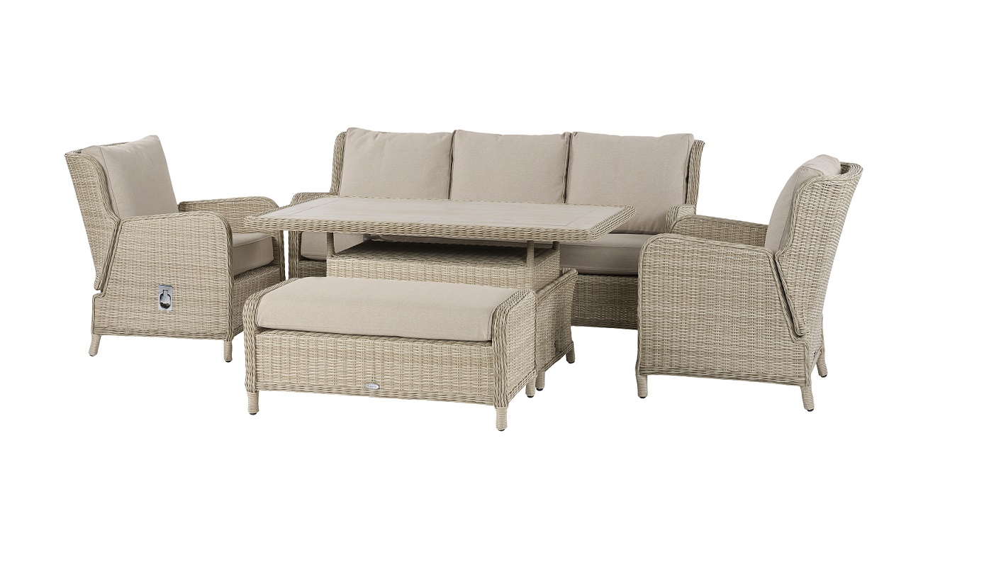 For a spot of sunbathing or stargazing, simply recline the sofa and armchairs and look skywards. Lots of eating and seating options for this highly versatile sofa and dining set rolled into one.