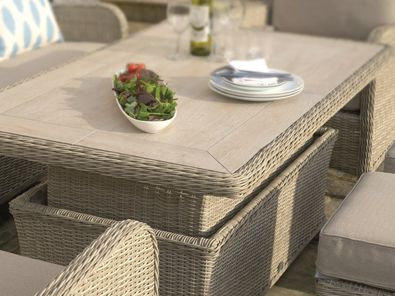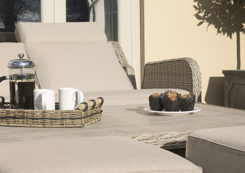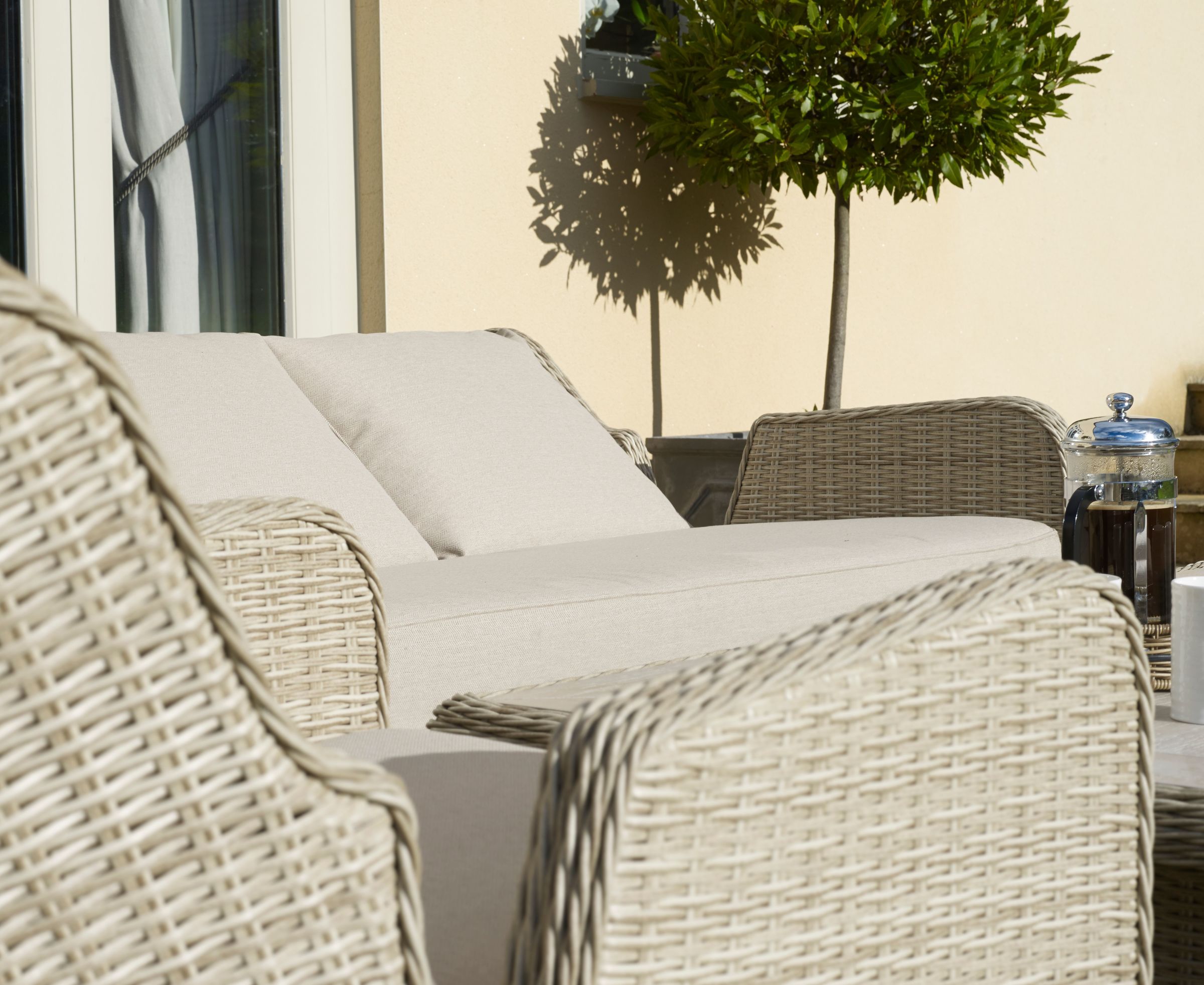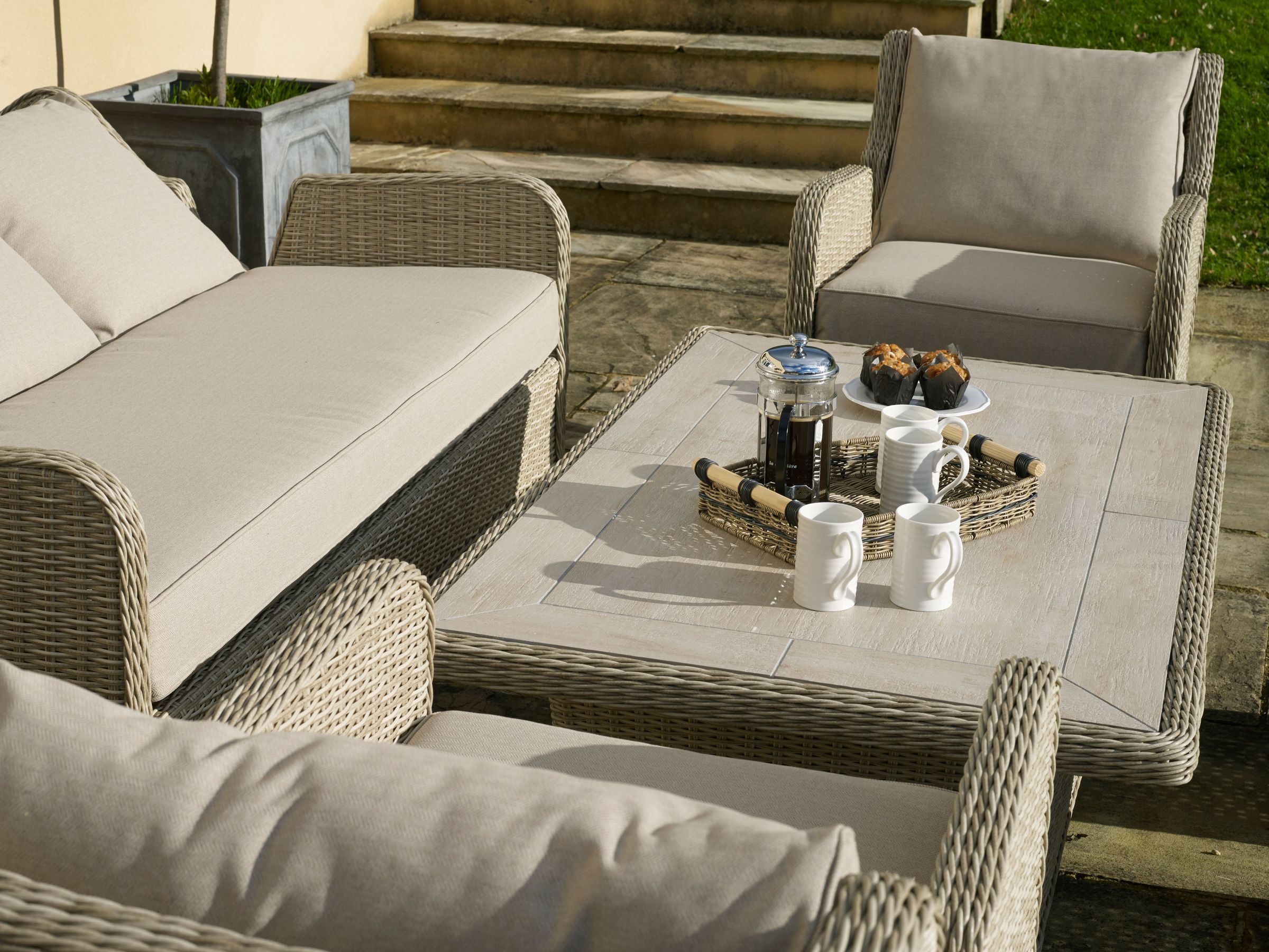 All-weather Sandstone rattan is built on a non-rusting aluminium frame, hence the furniture is lightweight and easy to move. Added to that are blissfully comfortable, soft-touch, Herringbone Barley cushions are made from season-proof fabric which is water, stain and frost-resistant. Plus, the sofa and armchairs feature a smooth reclining mechanism which can lay you back at any angle to suit. And the highly durable, ceramic table top is recessed into the weave for added protection and aesthetics.