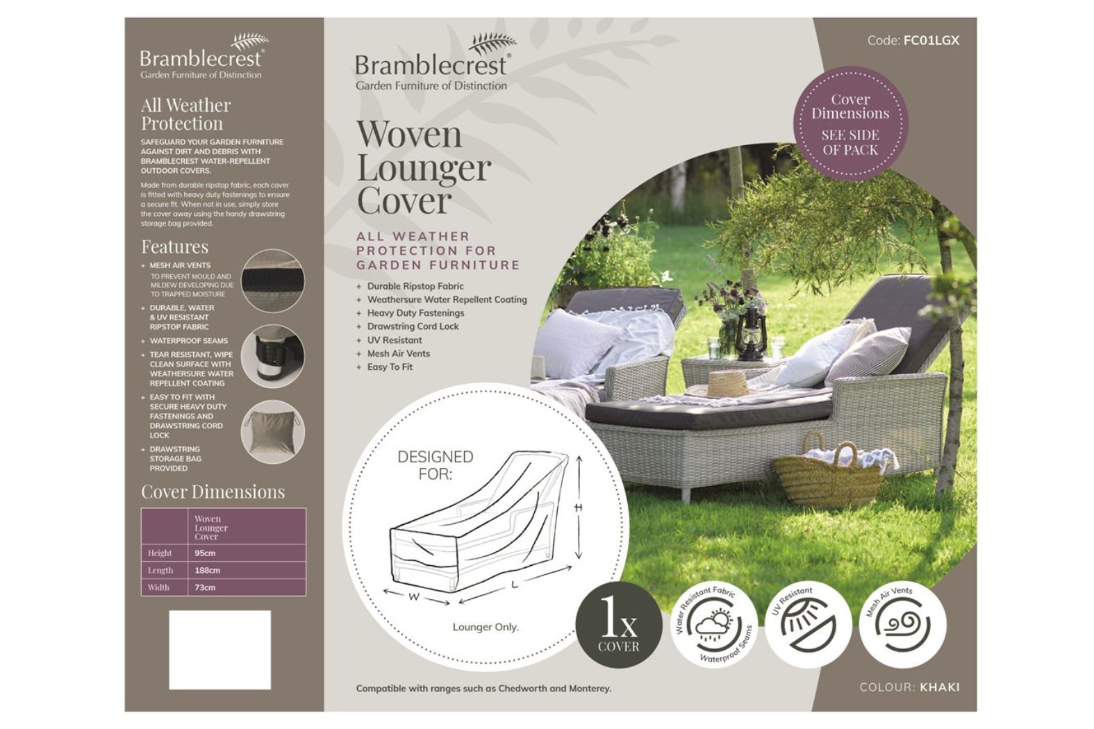 A weather-resistant, breathable cover tailored to protect your Bramblecrest Monterey or Chedworth woven lounger from rain, UV and everyday wear.