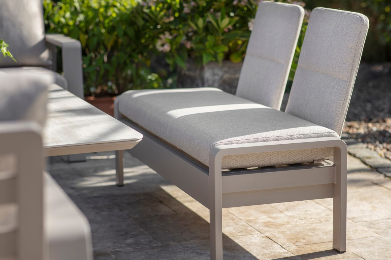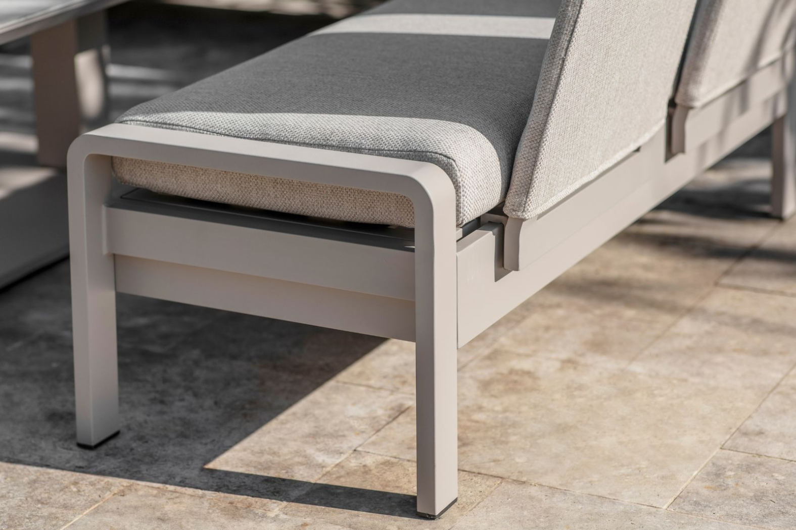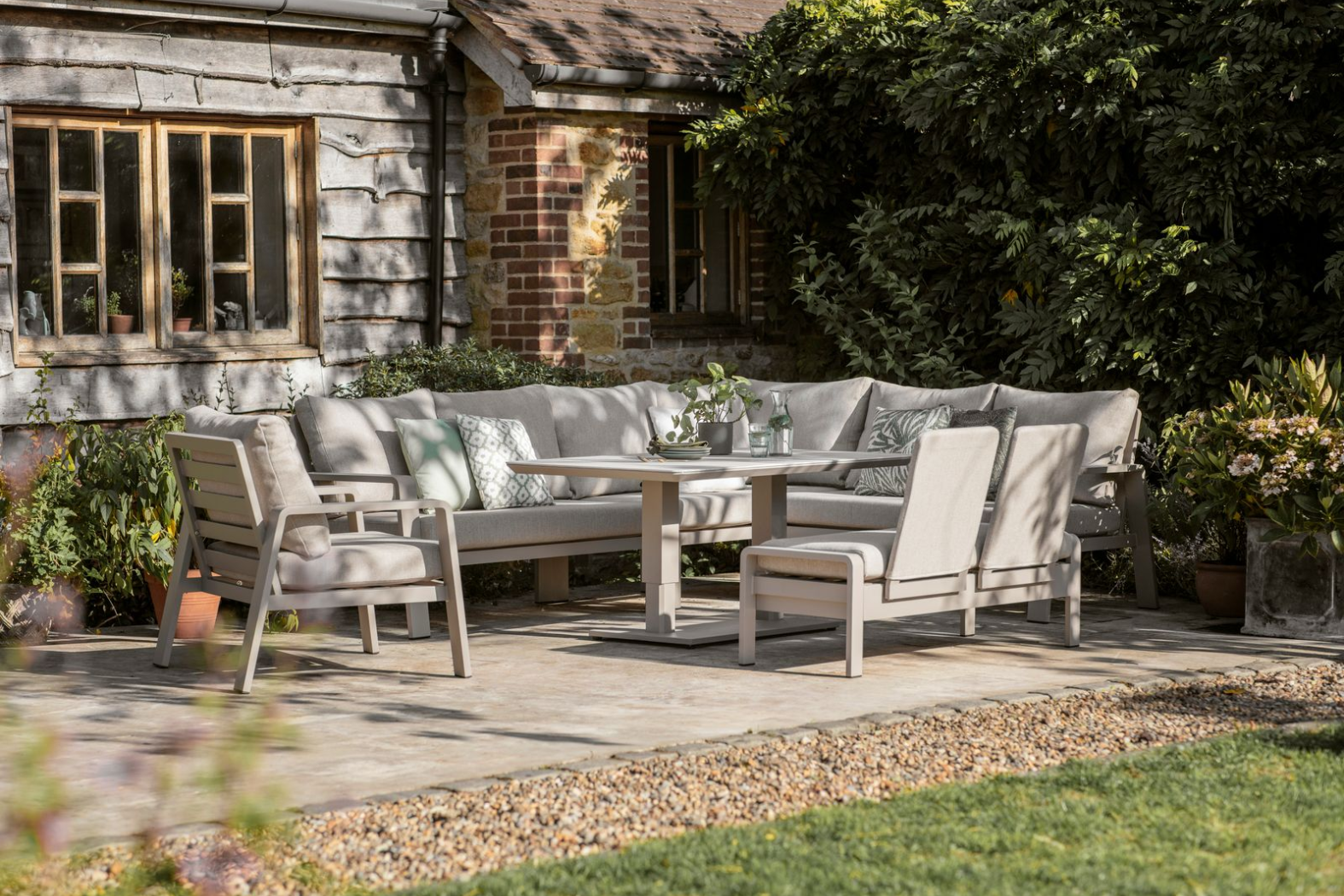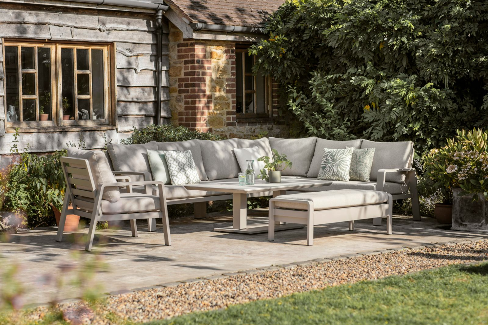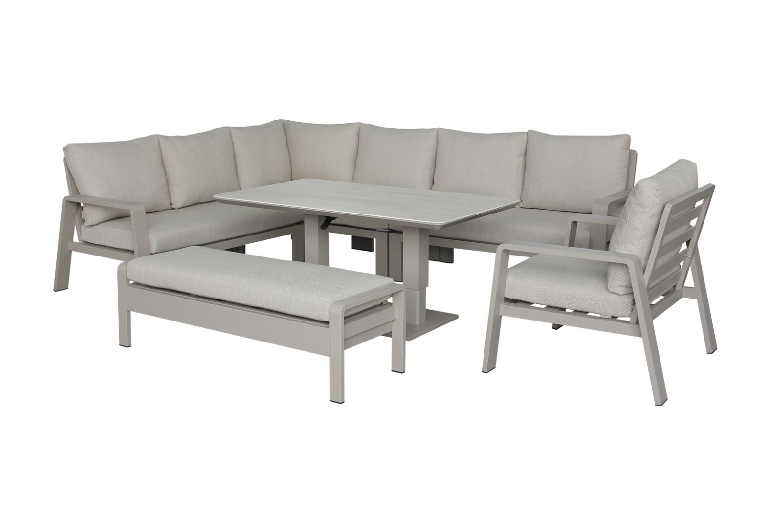 The Bramblecrest Prague L-Shape Sofa with Piston Adjustable Table with Bench & chair- Latte uses rust-resistant aluminium frames finished in a refined anthracite tone. The table features a Sinterstone top, delivering strength and weather-resistance in an elegant surface. Furthermore, the piston adjustment mechanism allows the table to transition between lounge-level and dining-height settings—making it versatile for casual chilling or more formal outdoor meals.