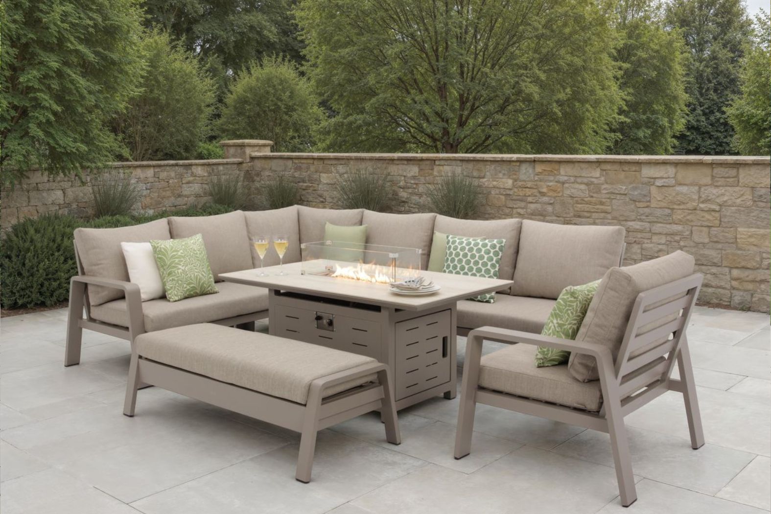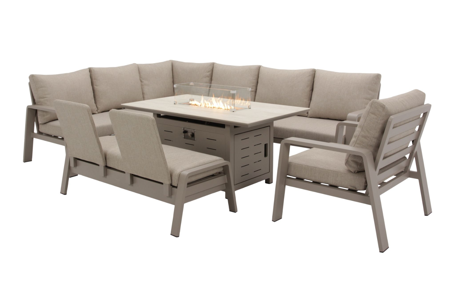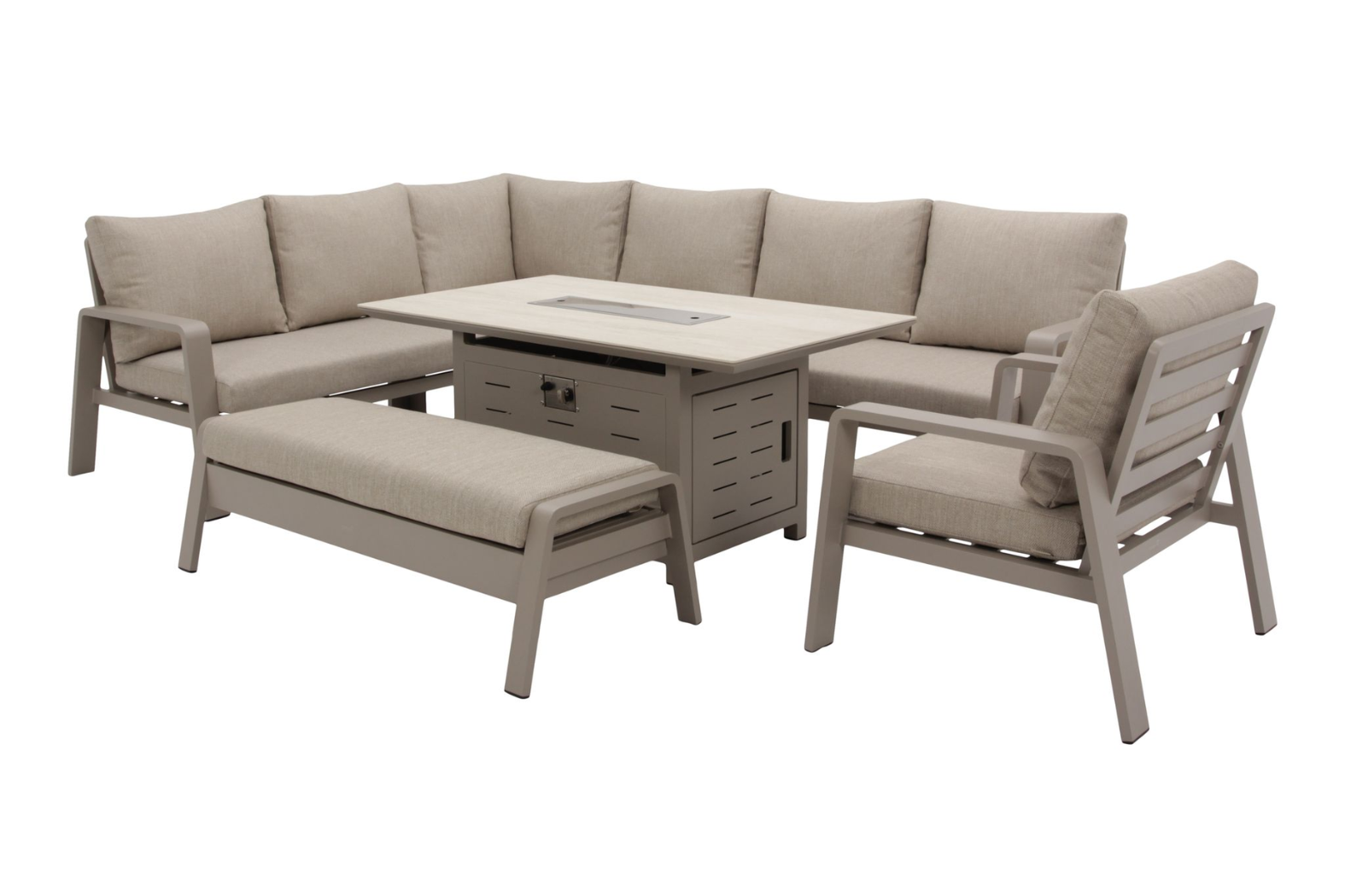 Bramblecrest Prague L Shape Sofa with Rectangle Firepit Table, Bench & chair -Latte