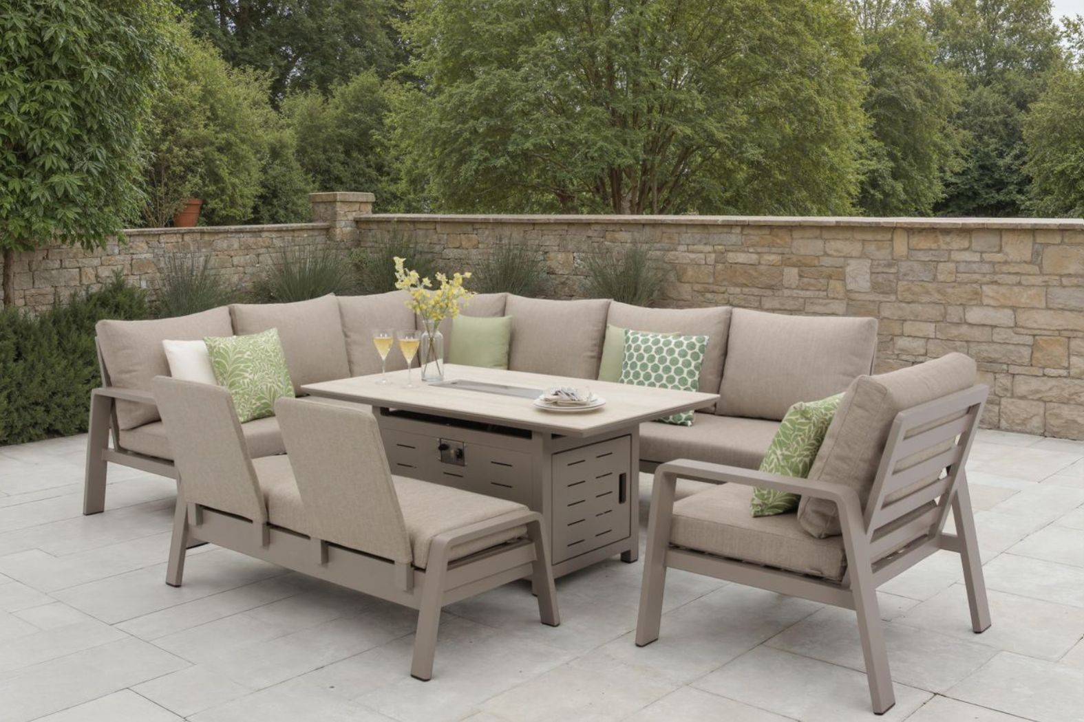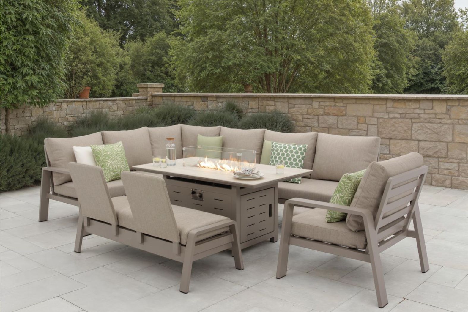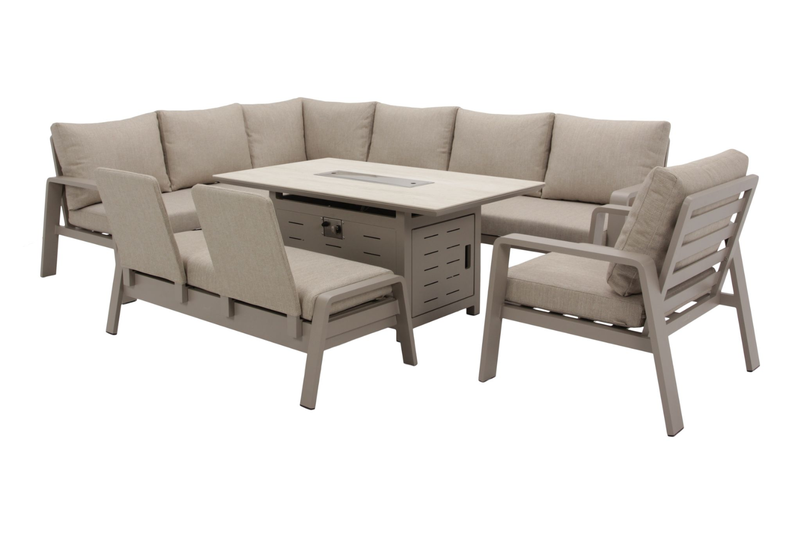 Bramblecrest Prague L Shape Sofa with Rectangle Firepit Table, Bench & chair -Latte