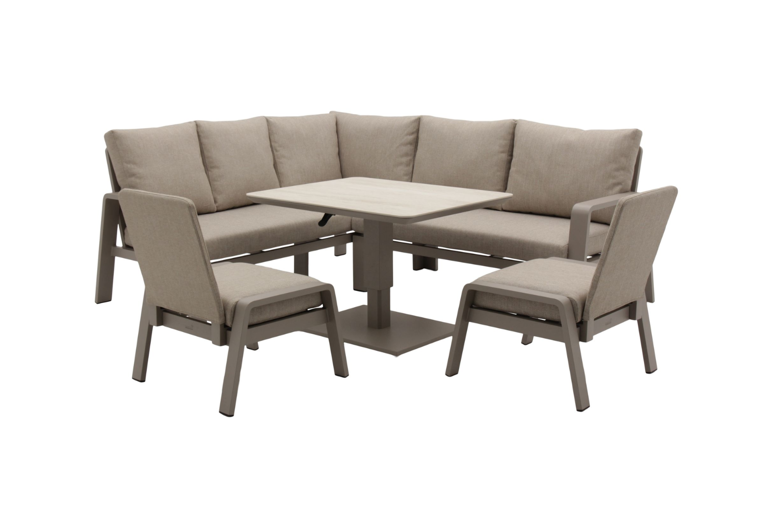 At the heart of this garden set is a piston-adjustable table. The table height adjusts easily — so you can switch from a low coffee-table position to a full dining height without fuss. This flexibility makes the set perfect for breakfasts, lunches or evening meals outdoors. In addition, the adjustable table suits different uses throughout the day — from casual drinks to full meals — giving you versatility in one compact set.