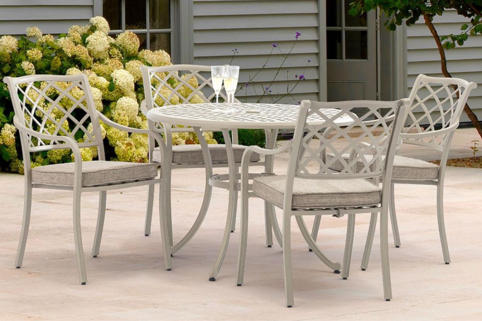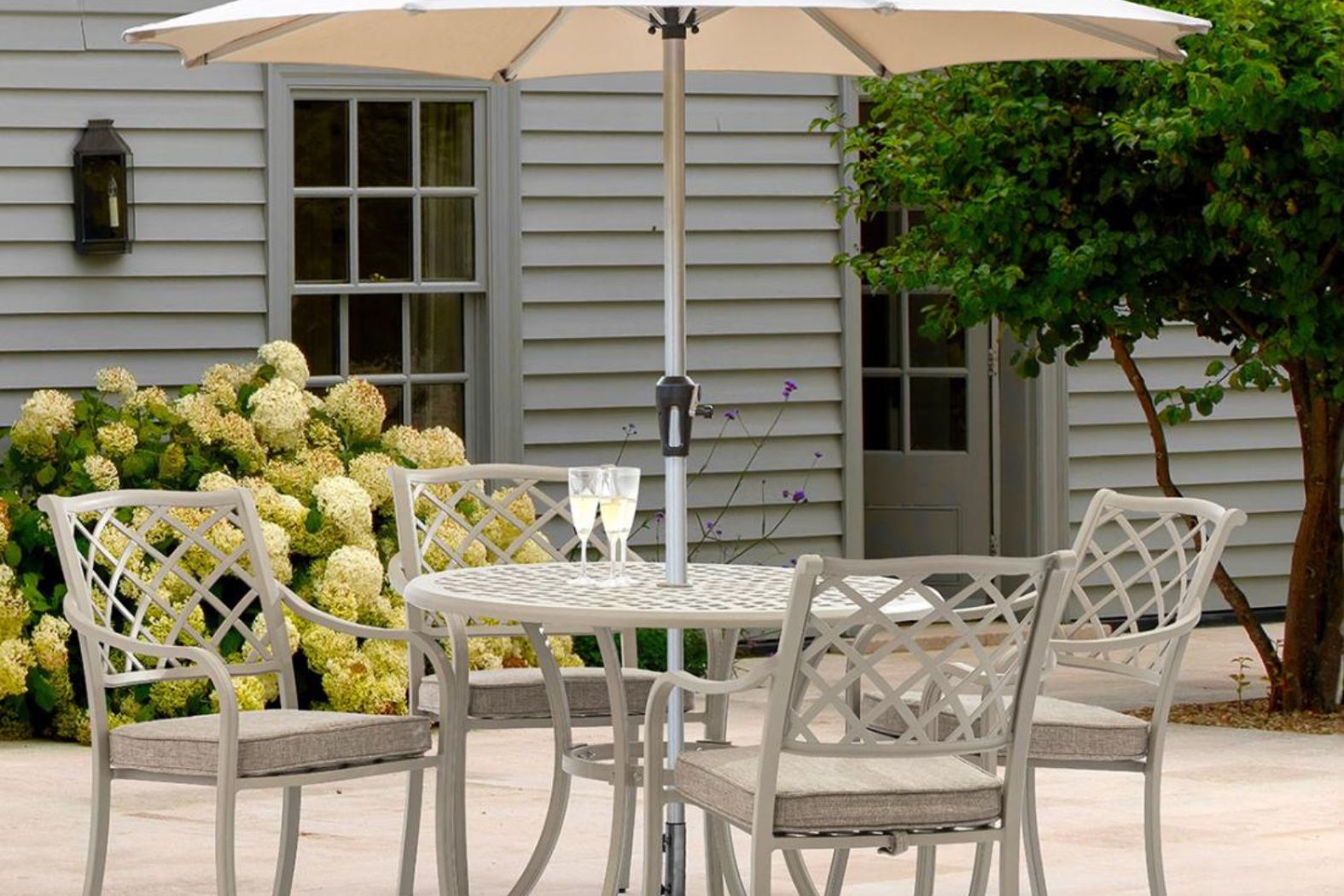 The Bramblecrest RHS Bridgewater 4-Seat Round Dining Set with Parasol & Base – Stone is an ideal addition to courtyards and walled gardens. Offering a cottage-style aesthetic, the RHS Bridgewater collection is a homage to classic English garden design with a timeless style. A pretty lattice design, cast aluminium in soft stone tones and a butterscotch cushion colour combine in a truly traditional take on outdoor dining and lounging.