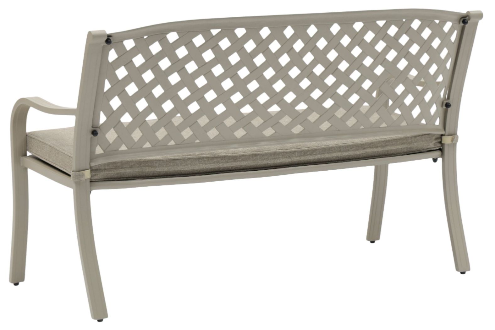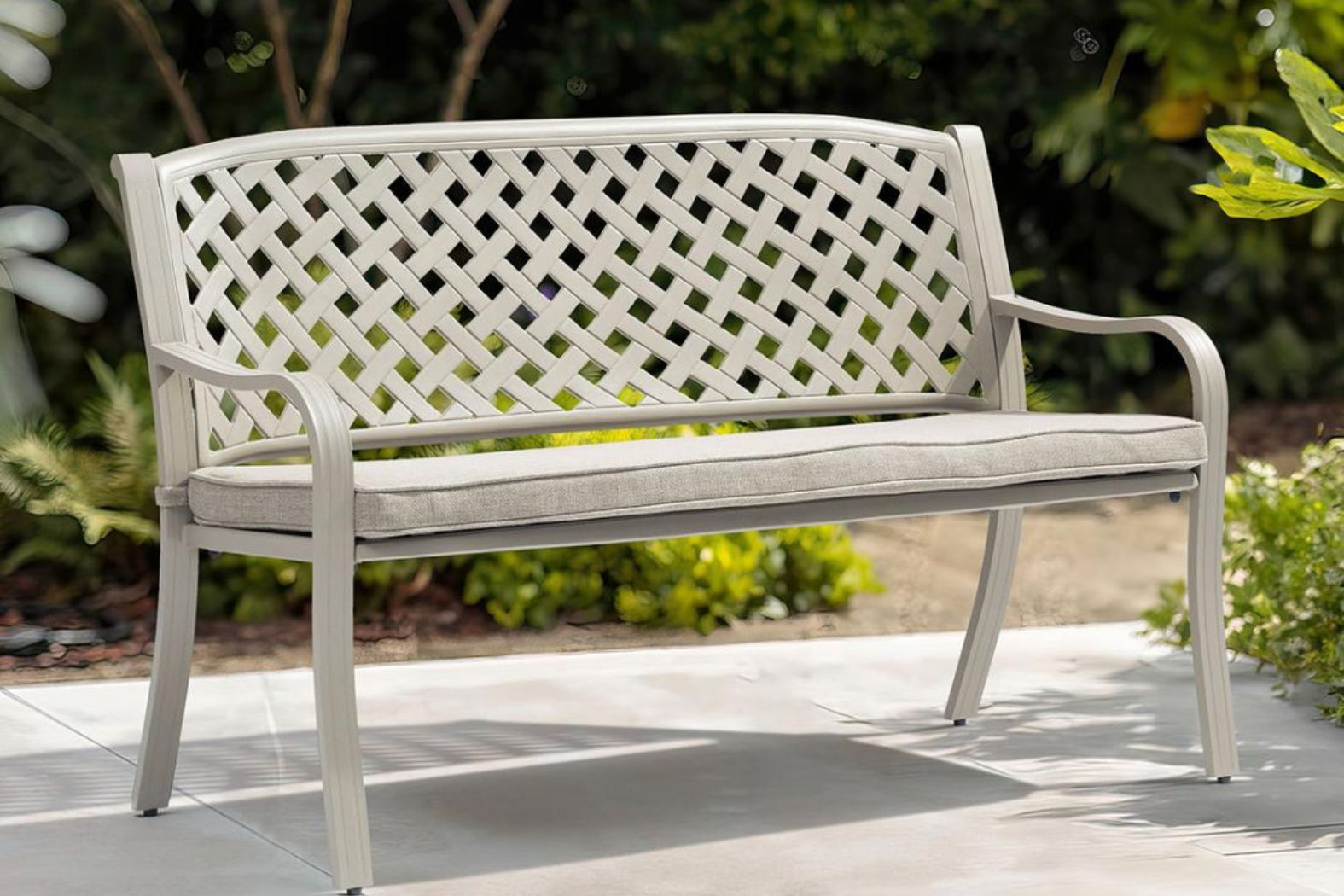 The bench features a classic lattice backrest with smooth, curved lines. This shape creates a charming cottage-garden look. In addition, the included season-proof cushion adds comfort and improves everyday usability. The cushion resists light rain and UV exposure, so it stays fresh and supportive for longer.