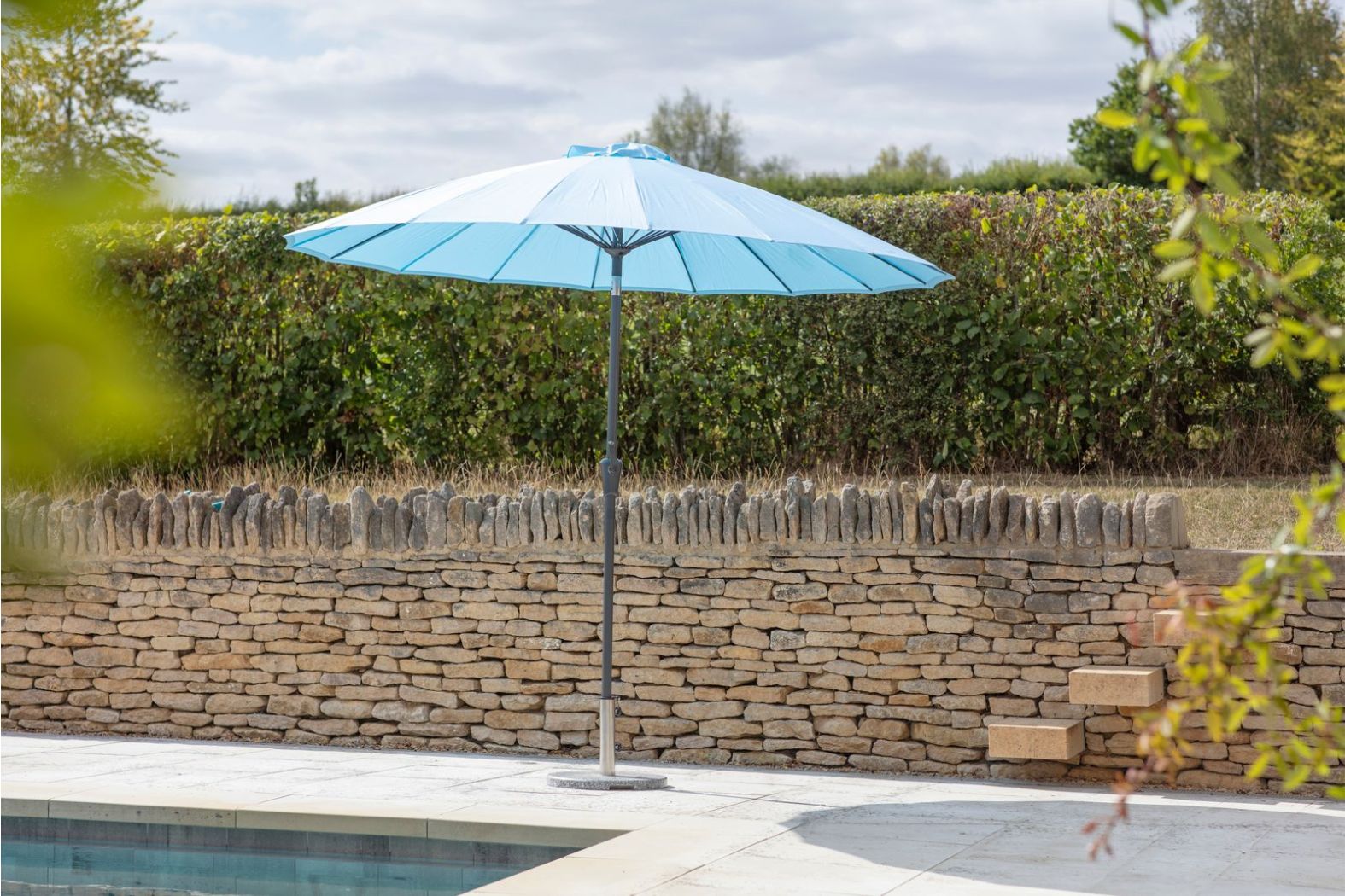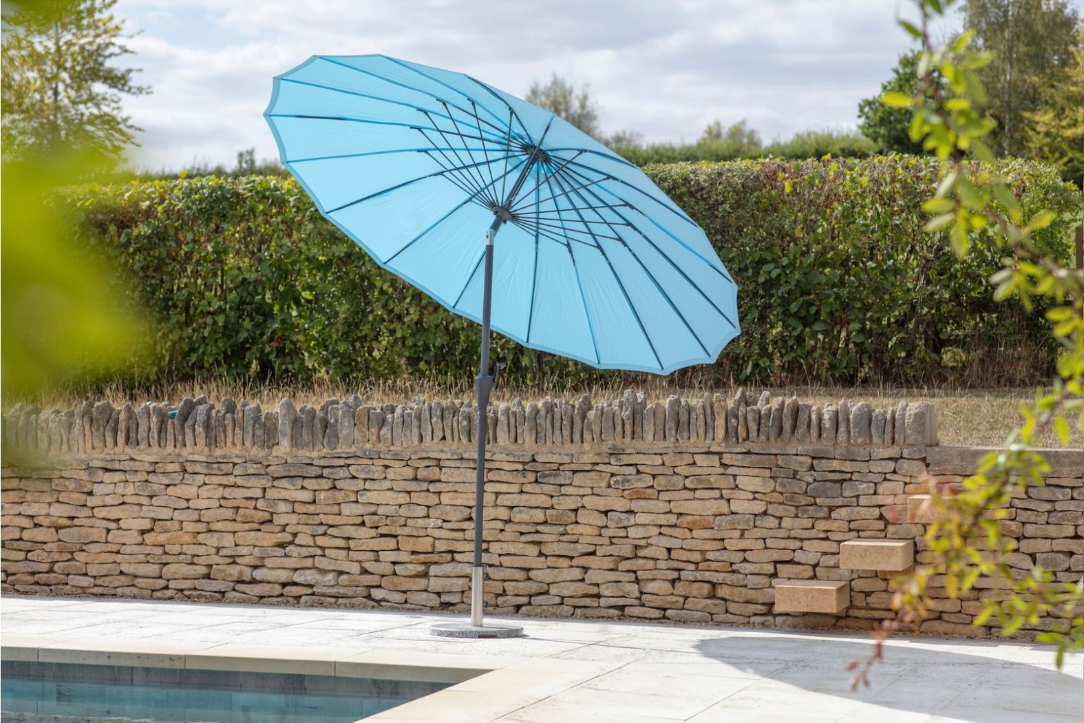 The Bramblecrest Shanghai parasol construction prioritises durability and long-term stability. The aluminium pole resists corrosion, while the polyester canopy withstands light showers and UV exposure. Furthermore, the canopy fabric holds its colour well, helping maintain the Sky Blue finish over time. This dependable build ensures reliable shade season after season.