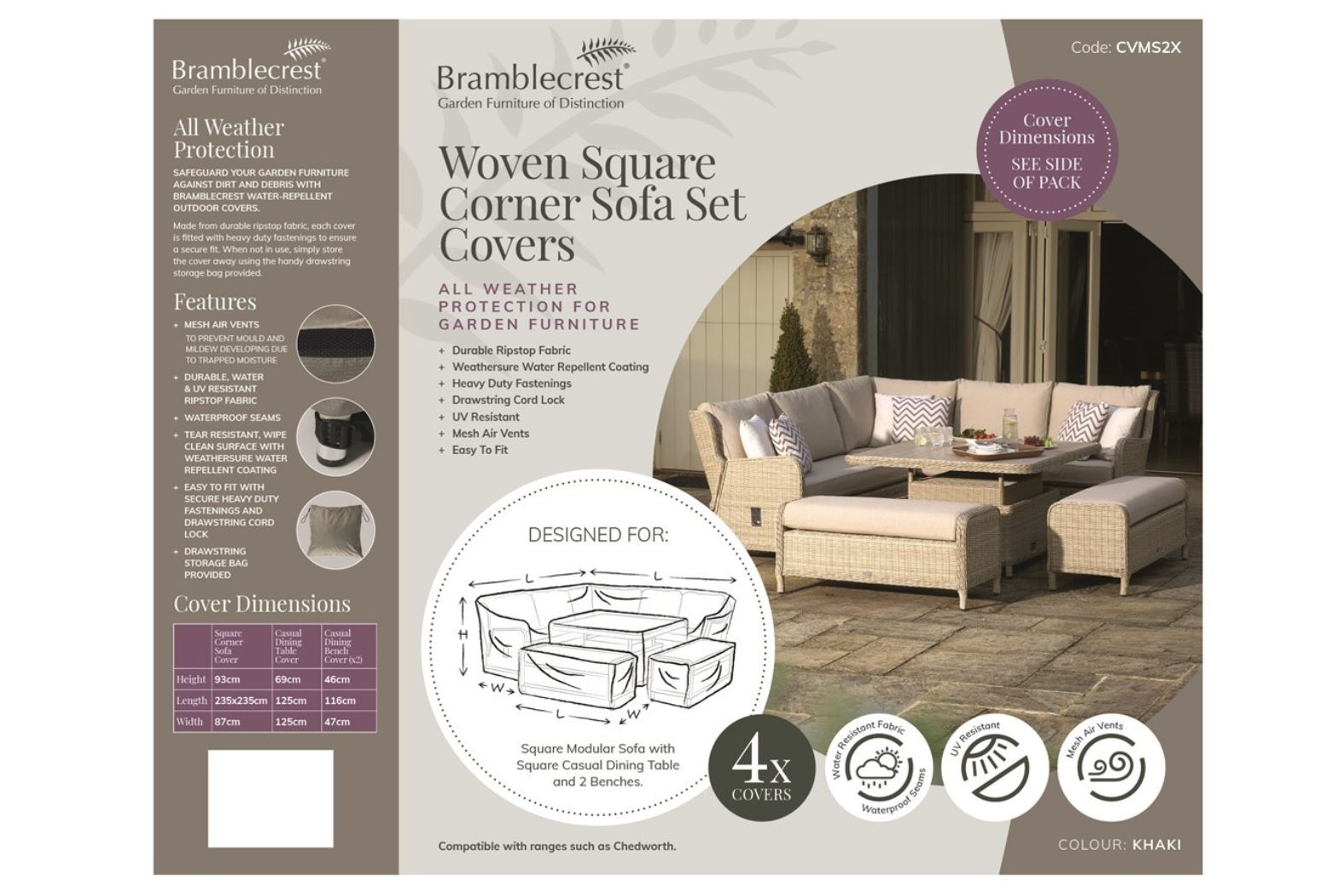 – Includes 1 x Square Sofa Cover, 1 x Casual Dining Table Cover & 2 x Dining Bench Covers