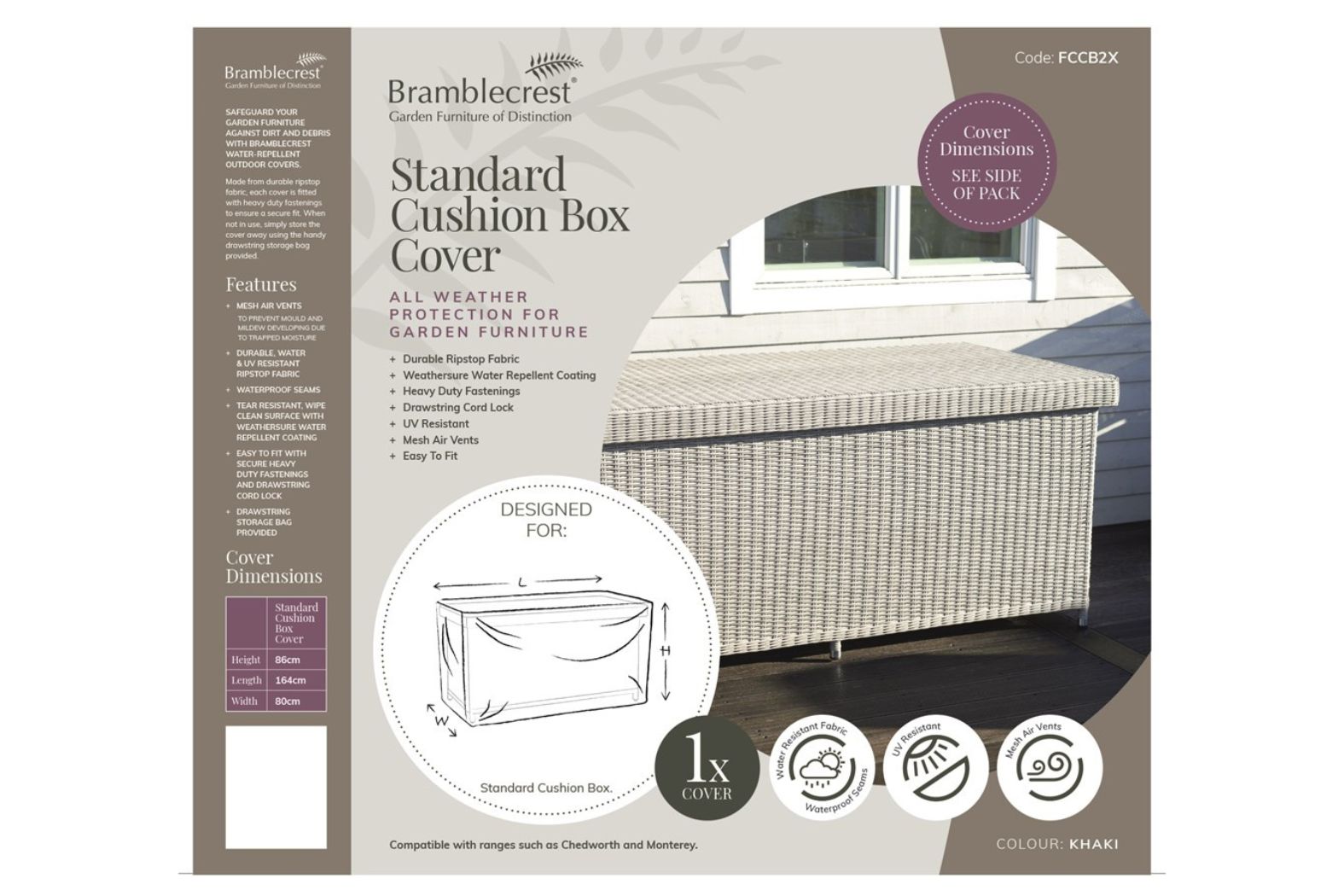 The Bramblecrest Standard Cushion Box Cover lets you leave your outdoor storage box outside with confidence. It fits the “standard” cushion-box size (approx. 86 cm H × 80 cm W × 164 cm D) and shields it from rain, snow, fading from sun and garden debris.