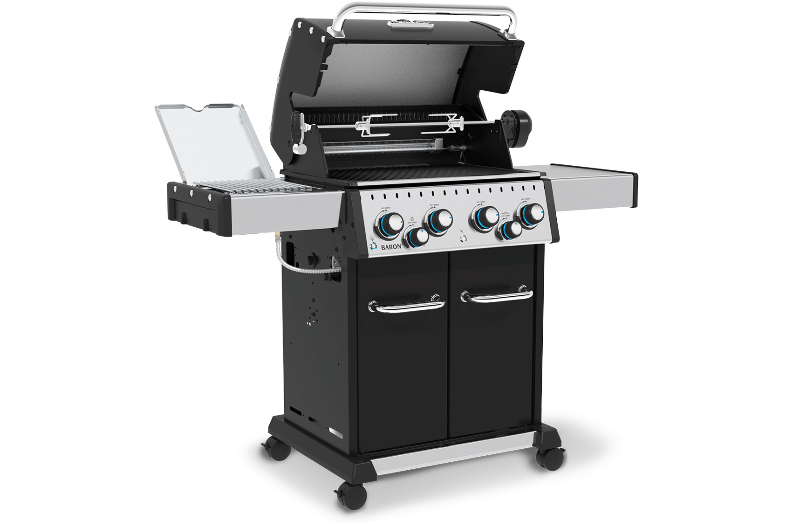 The large, enclosed cabinet gives room for gas cylinder storage and stainless-steel side shelves featuring tool hooks. Each burner is independently controlled by the simple to use control taps and electronic ignition. All mounted on a stainless-steel fascia panel.