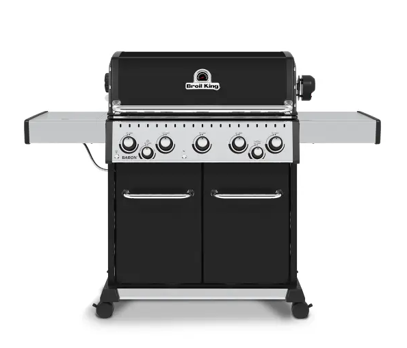 The Broil King Baron 590 IR Gas BBQ features 3,677 sq. cm primary cooking surface and includes 5 stainless steel Dual-Tube™ burners, cast aluminium cook-box, reversible heavy-duty cast iron cooking grids, illuminated control knobs, stainless steel Flav-R-Wave™ cooking system and electronic ignition. The 500 series features stainless steel drop-down side shelves and enclosed cabinet base.