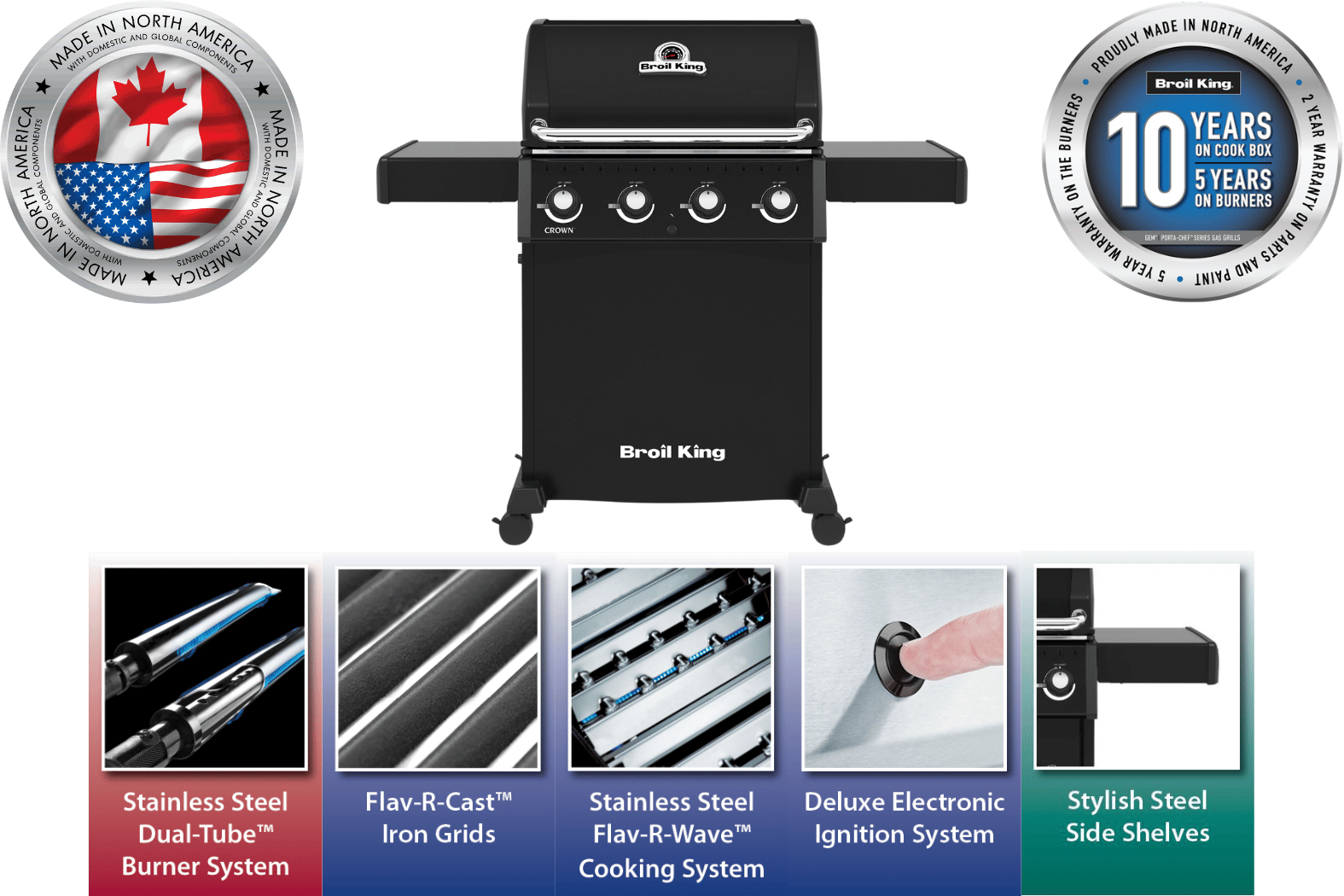 The Crown Series offers performance and versatility with a contemporary look. The Broil King Crown 410 features cast-iron cooking grids to sear the perfect steak. Stainless-steel Flav-R-Wave vaporises juices and infuses them back into your food for great flavour. Powerful side-ported dual-flame tube burners provide twice the amount of heat per burner. Linear-Flow valves allow for precise cooking control and Sure-Lite ignition makes starting your barbecue quick and easy. Add a convenient side burner to create mouth-watering side dishes like soups, sauces, or stir-fries while you grill. The versatile Broil King Crown 410 is designed for performance and great value.