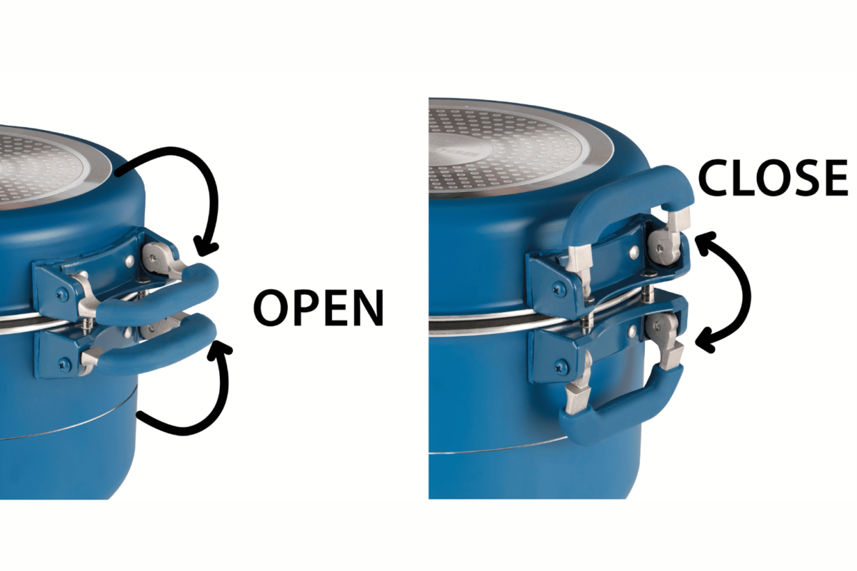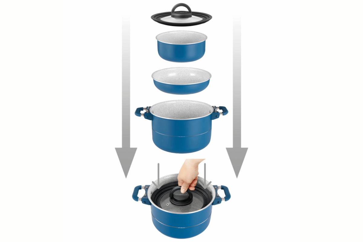 - Vacublock stacking system — locks pots and pans together to prevent rattling and shifting during transport.