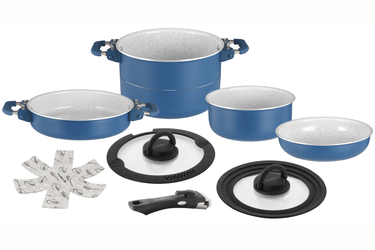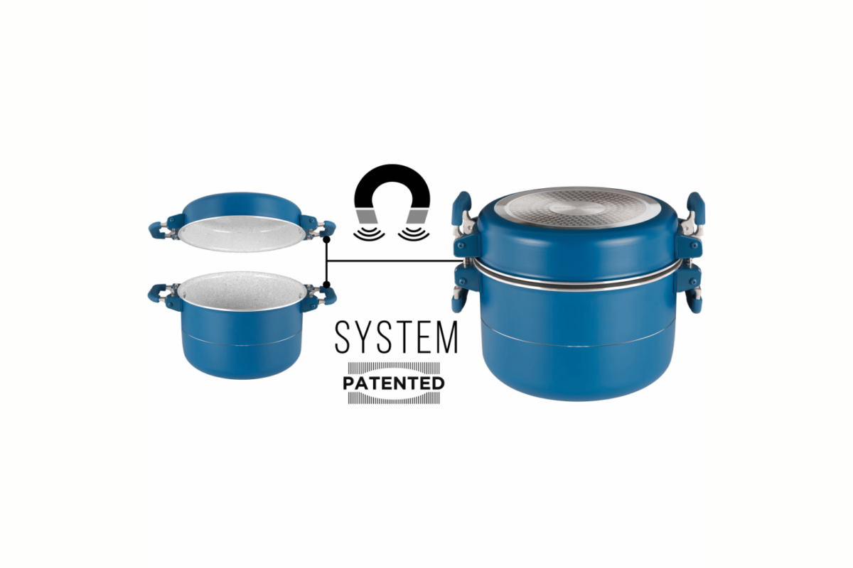 Take cooking on the go to another level with the Brunner Carezza Magnetogrip 7+1 Ø 20 cm Cookware Set — a highly compact, stackable and versatile set ideal for small kitchens, boats, camper vans, caravans or compact living spaces. This set gives you full cooking capability without demanding much storage space. Furthermore, the induction-compatible base and scratch-resistant ceramic non-stick coating deliver reliable performance and easy cleaning. In addition, the innovative Magnetogrip system and Vacublock stacking design keep everything safely secured during transport. A real advantage in moving setups or confined kitchens.