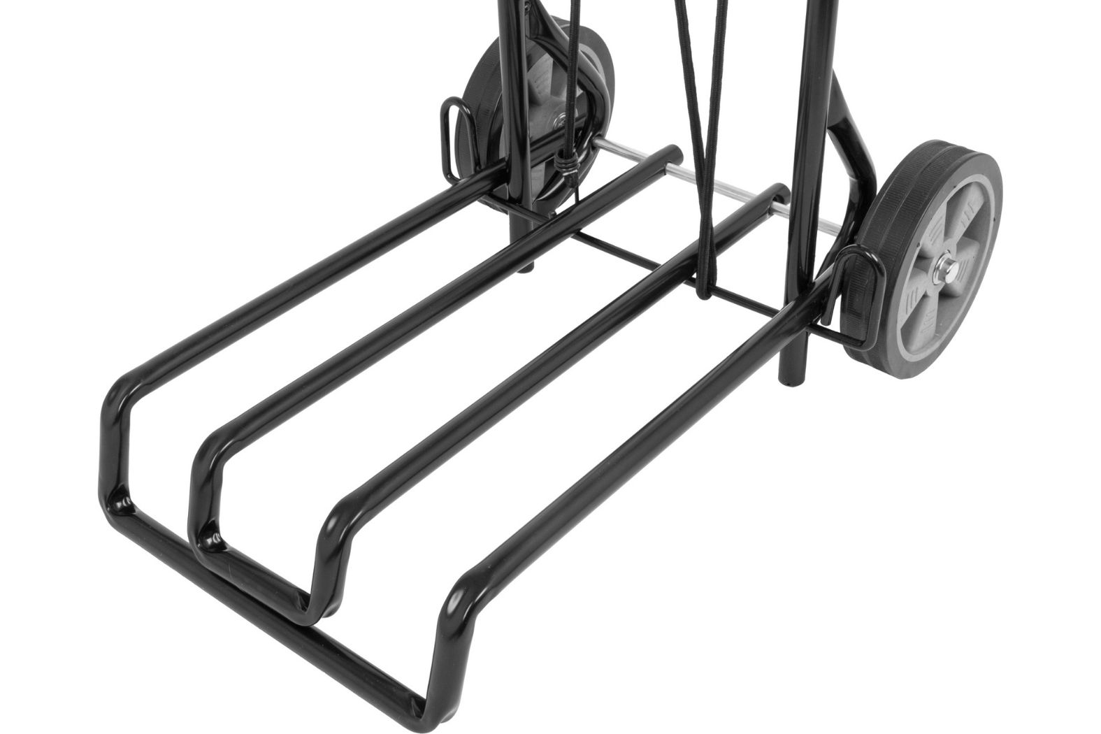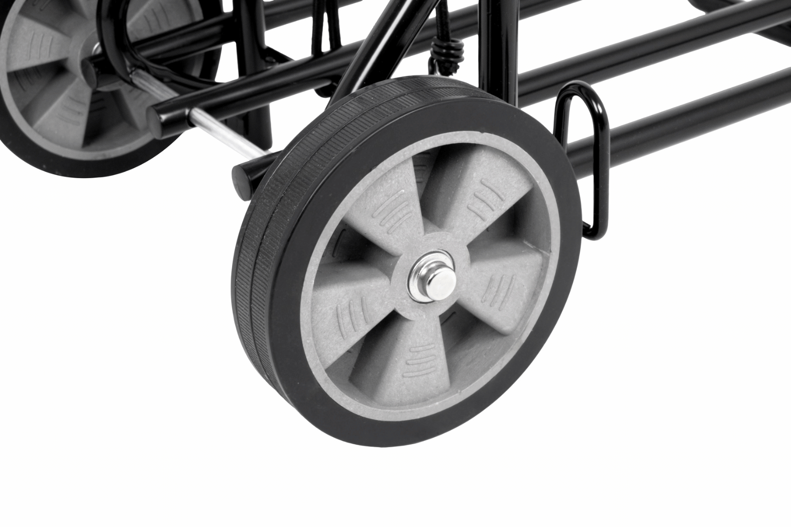 This folding trolley features a strong metal frame that provides dependable support for a wide range of loads. Furthermore, the smooth-running wheels allow effortless movement across firm ground, pavements and campsite surfaces. In addition, the wheel spacing improves balance and stability, helping prevent tipping when transporting awkward items. Moreover, the robust axle construction ensures consistent performance during repeated use.