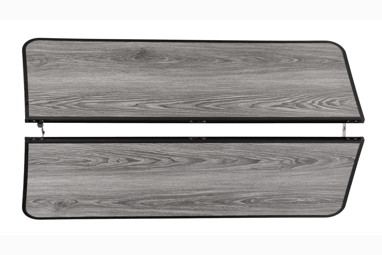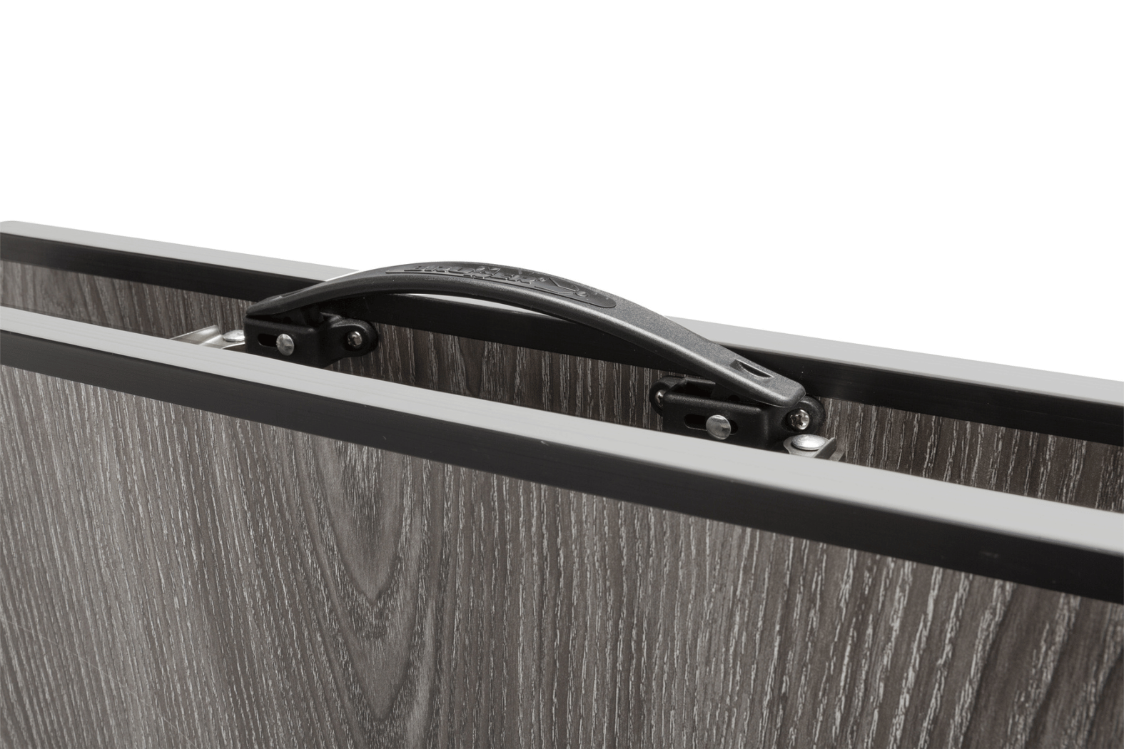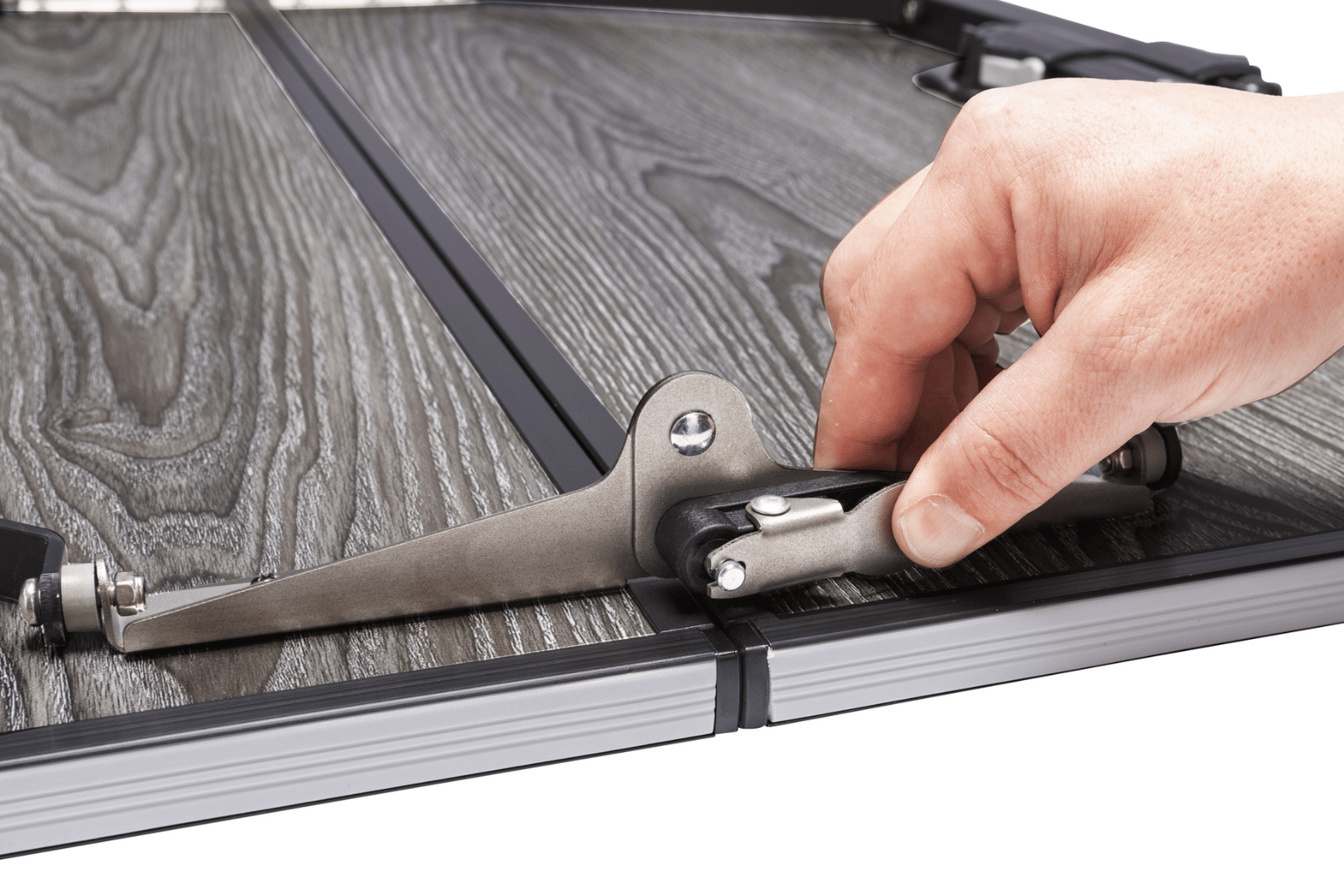 The Elù Duplit NG features a strong aluminium frame that keeps weight down yet delivers stability on site. Furthermore, the tabletop is a multi-layer, weather-resistant surface with a honeycomb structure and reinforced edges — it resists moisture, shock and everyday use. In addition, the tabletop has a foldable section to reduce pack size and improve transportation ease. The design also includes impact-protection edges with rounded corners and an exclusive grey wood décor finish that blends into modern awning and patio setups. According to manufacturer specs, the opened size is approx. 110 × 75 × H43-70 cm; when folded it reduces to roughly 110 × 38.5 × 10 cm, and the net weight is approx. 7 kg.