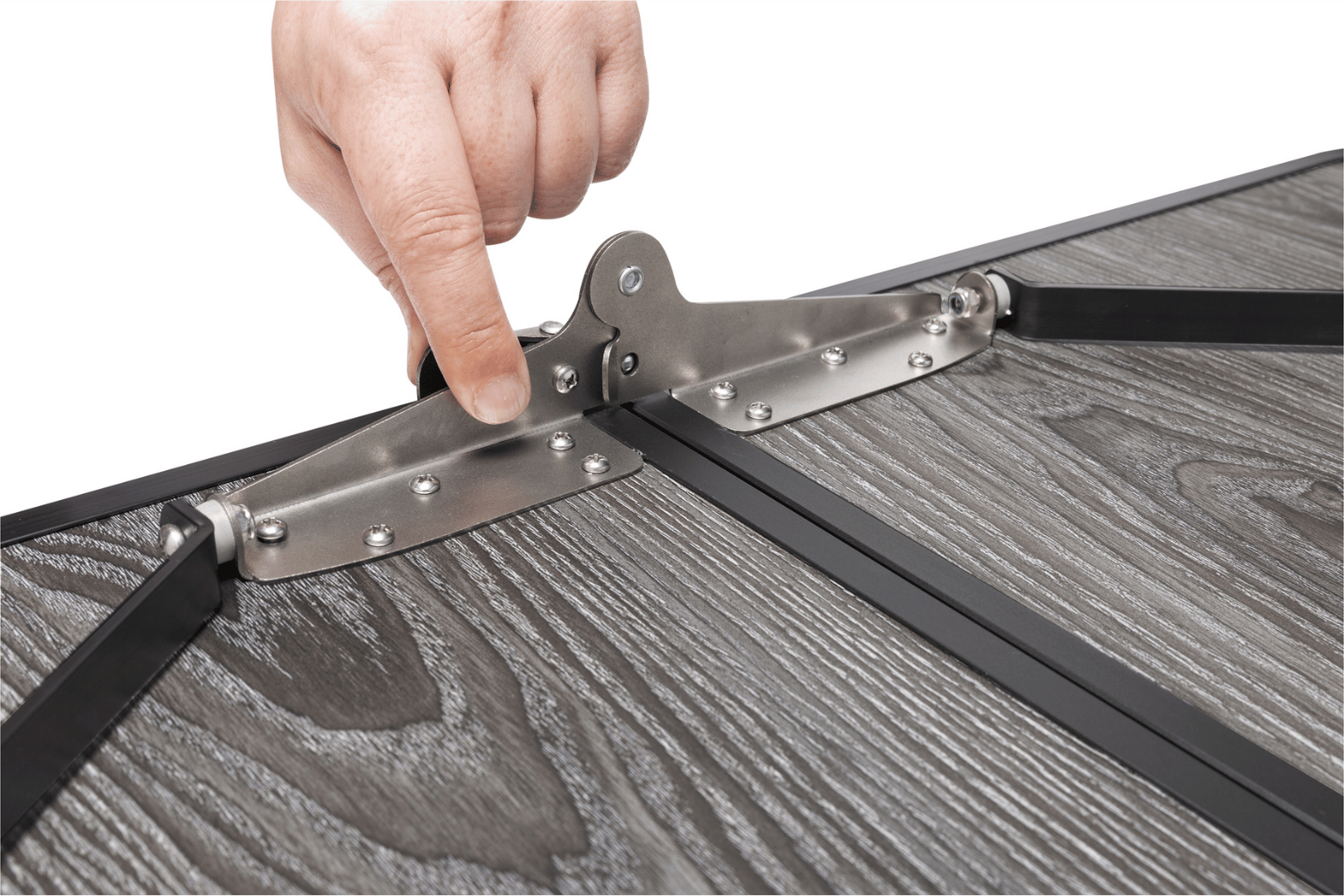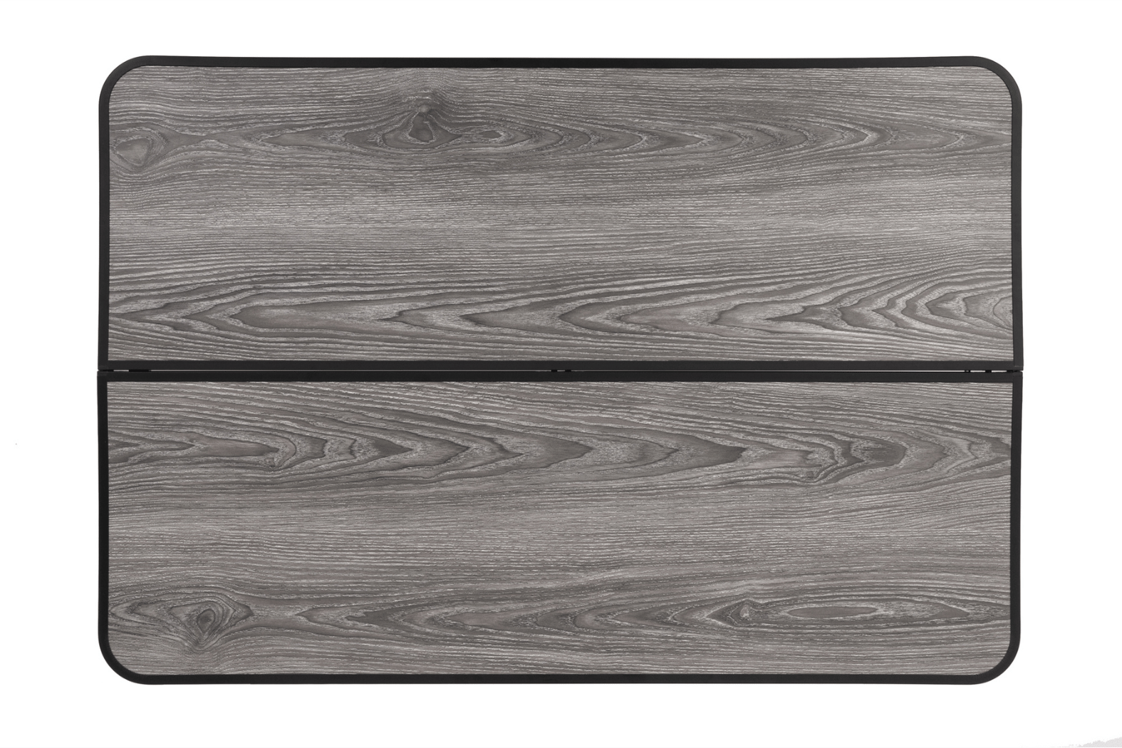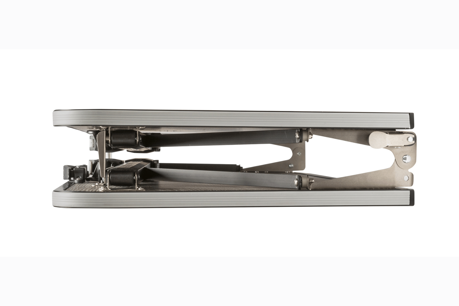 The Elù Duplit NG features a strong aluminium frame that keeps weight down yet delivers stability on site. Furthermore, the tabletop is a multi-layer, weather-resistant surface with a honeycomb structure and reinforced edges — it resists moisture, shock and everyday use. In addition, the tabletop has a foldable section to reduce pack size and improve transportation ease. The design also includes impact-protection edges with rounded corners and an exclusive grey wood décor finish that blends into modern awning and patio setups. According to manufacturer specs, the opened size is approx. 110 × 75 × H43-70 cm; when folded it reduces to roughly 110 × 38.5 × 10 cm, and the net weight is approx. 7 kg.
